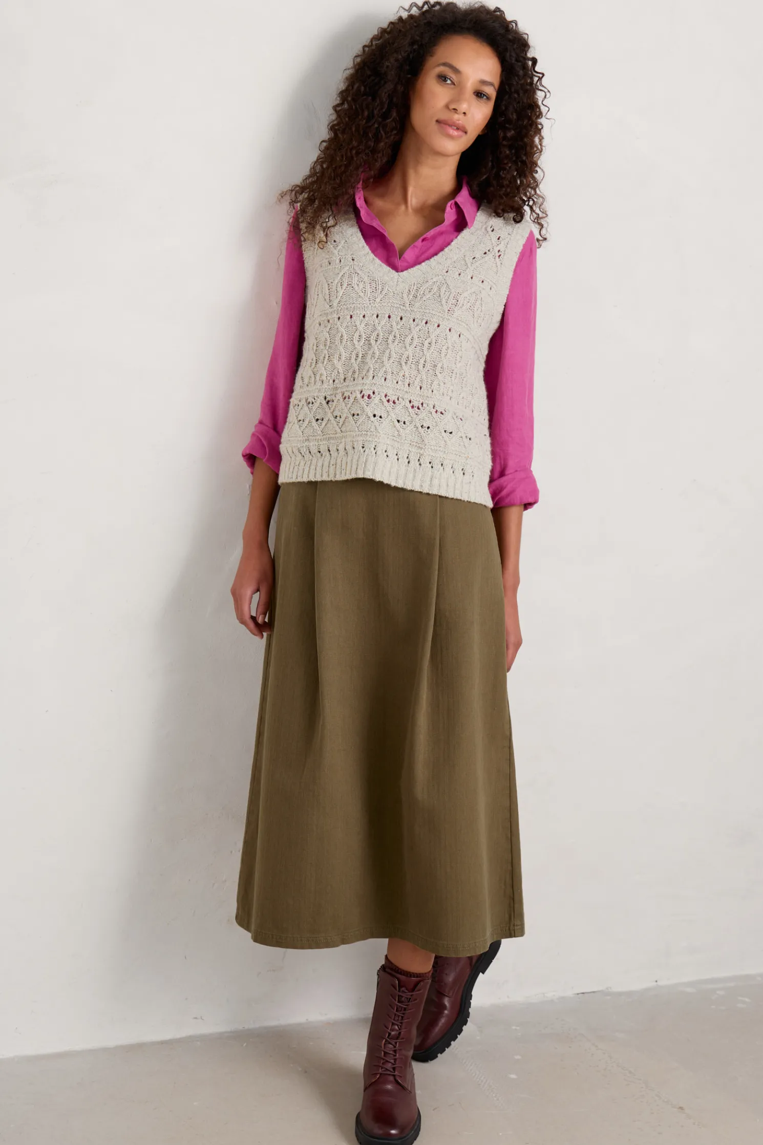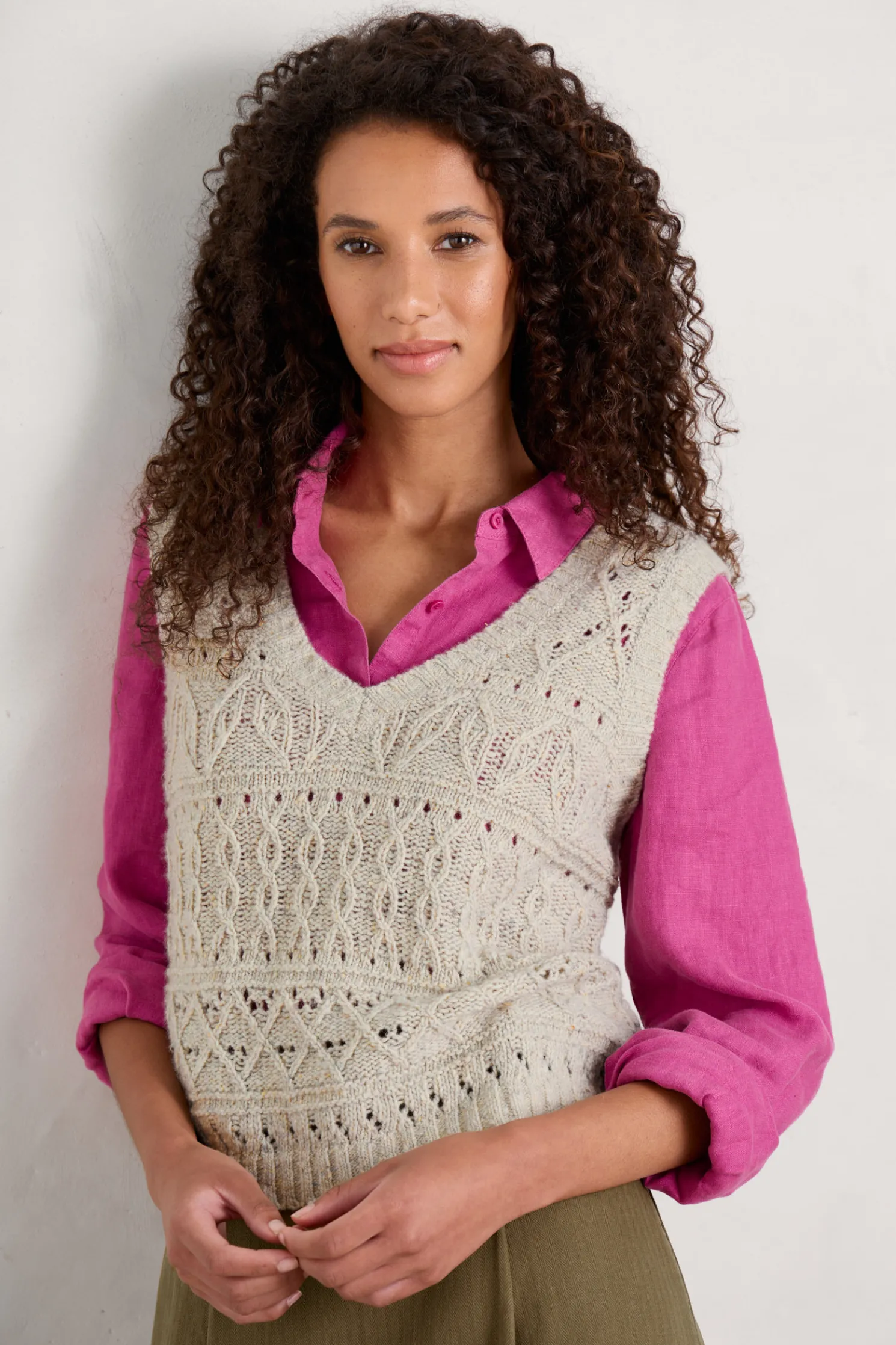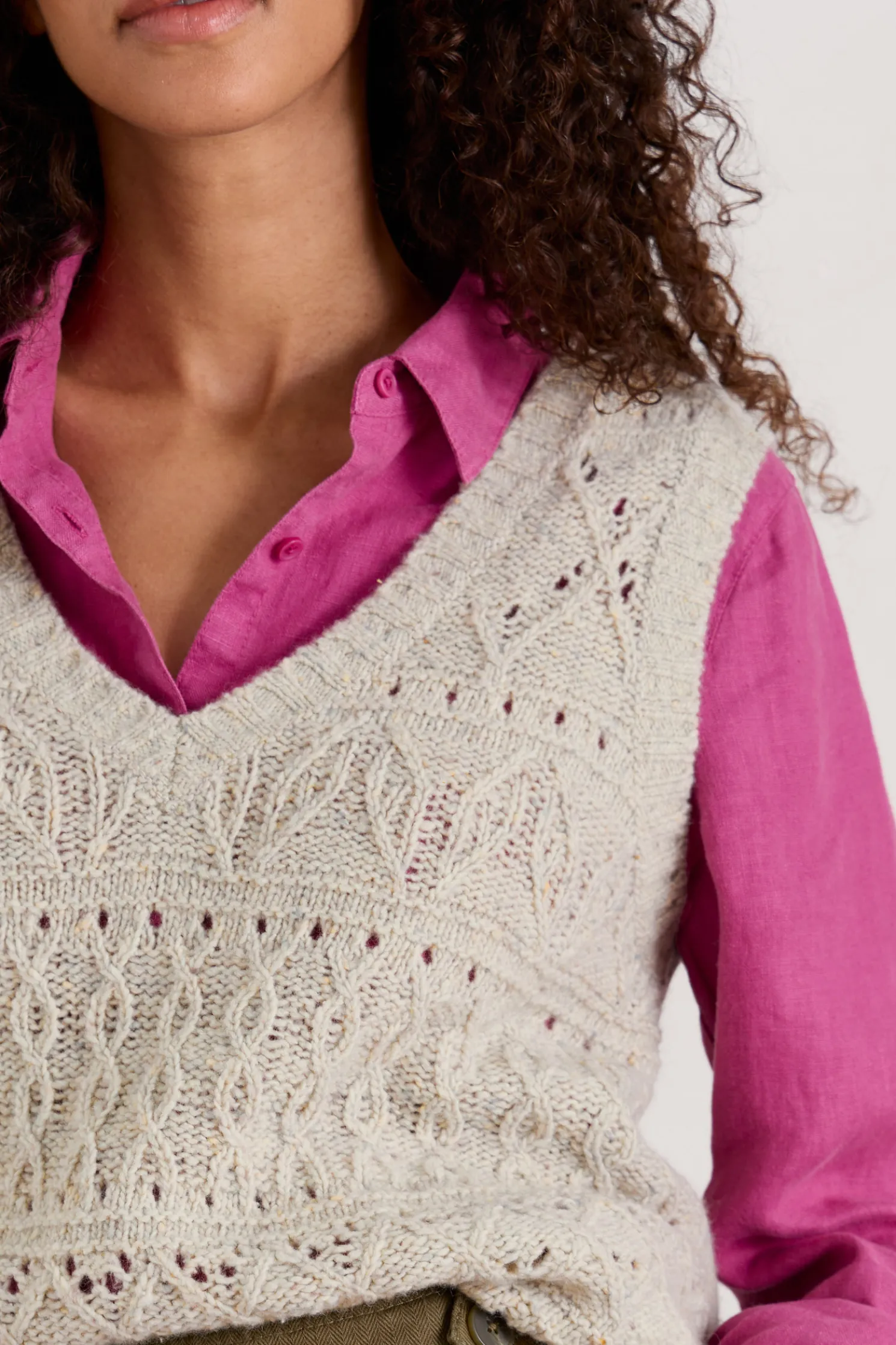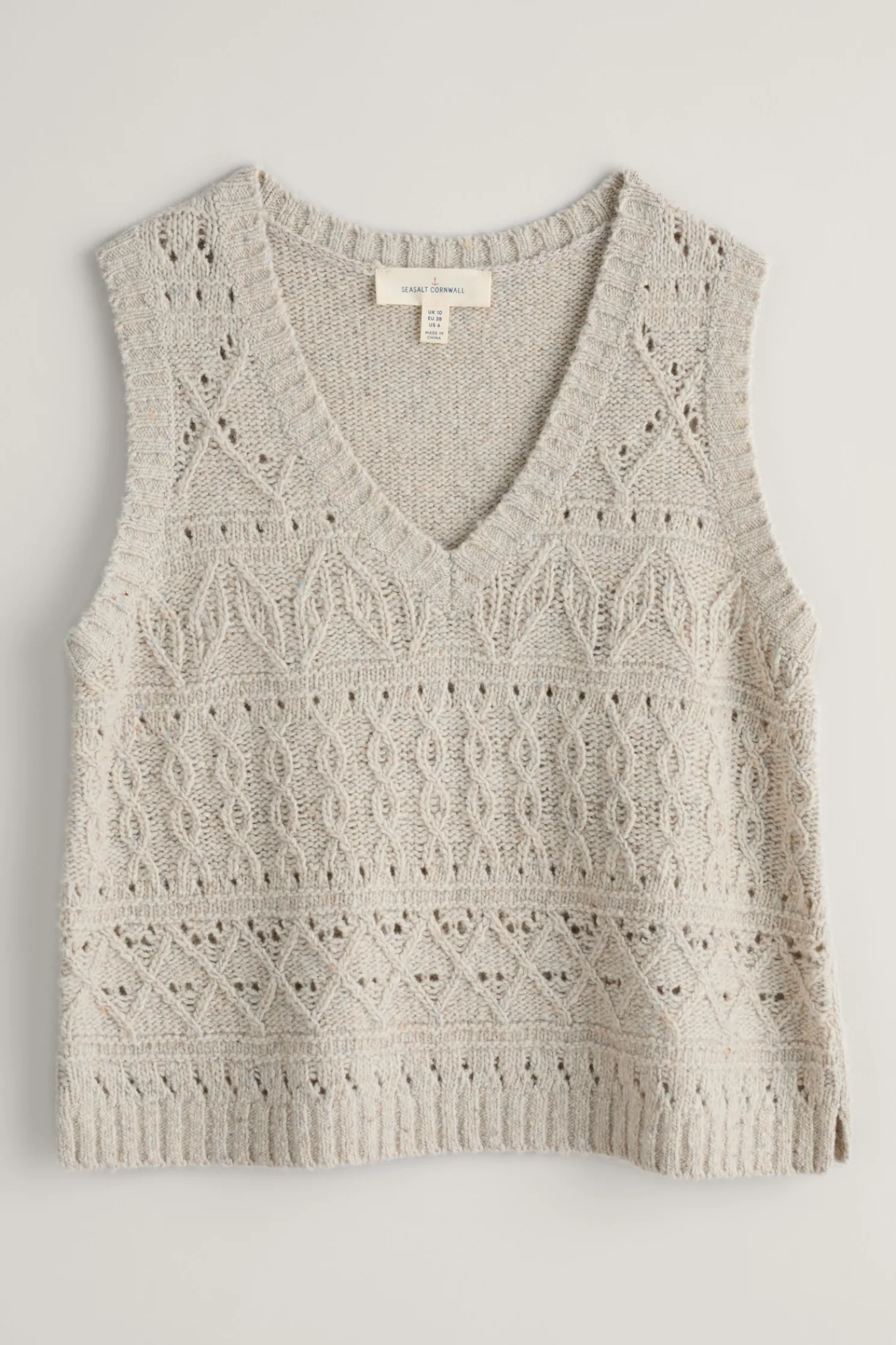 A Soft Pointelle Knitted Vest With A Lovely Melange To The Merino-Rich Yarn Blend. The Easy Fit Has A Slightly Cropped Finish, Which Makes It Great For Layering With Dresses Or Tops.