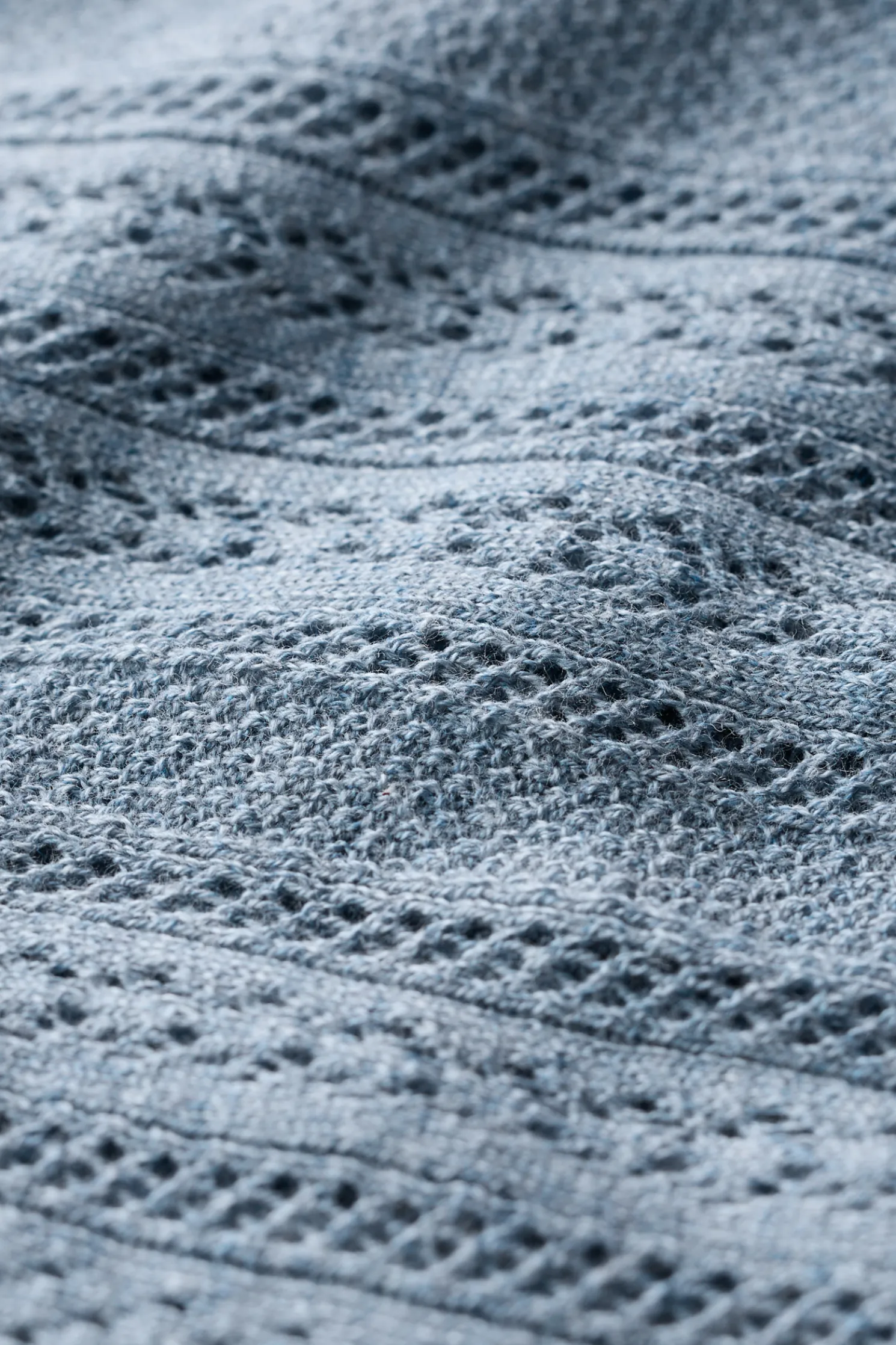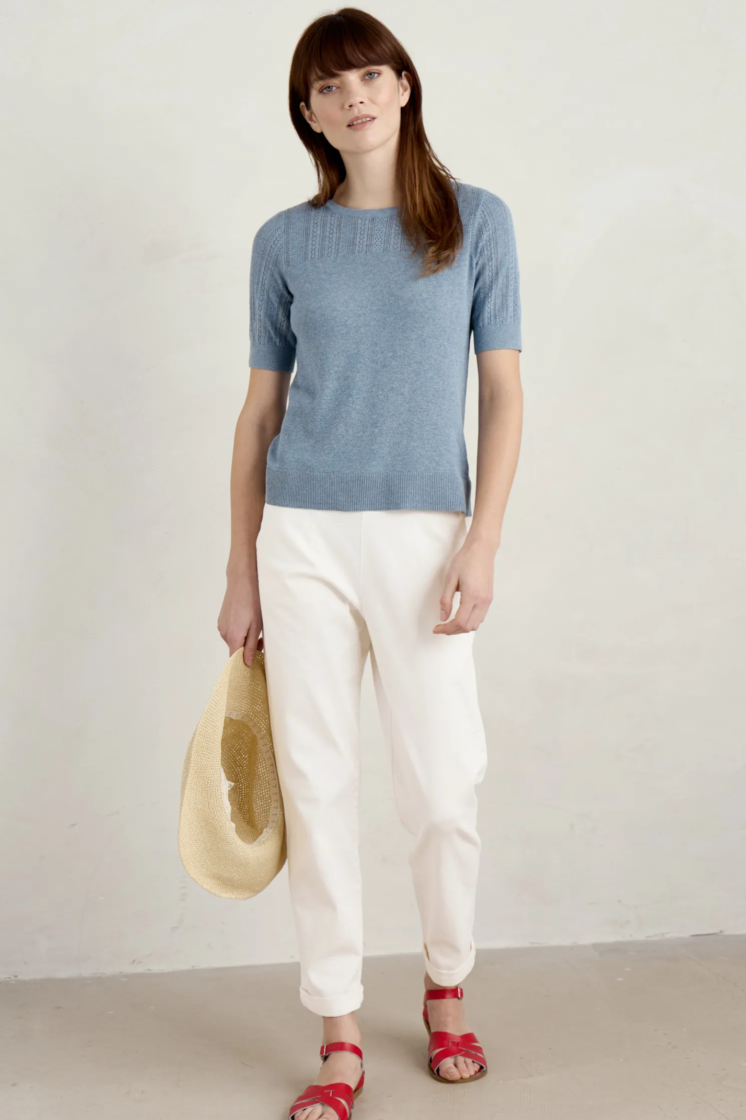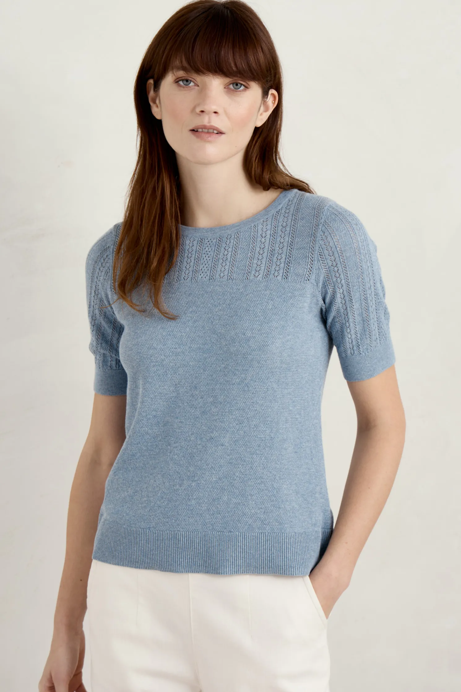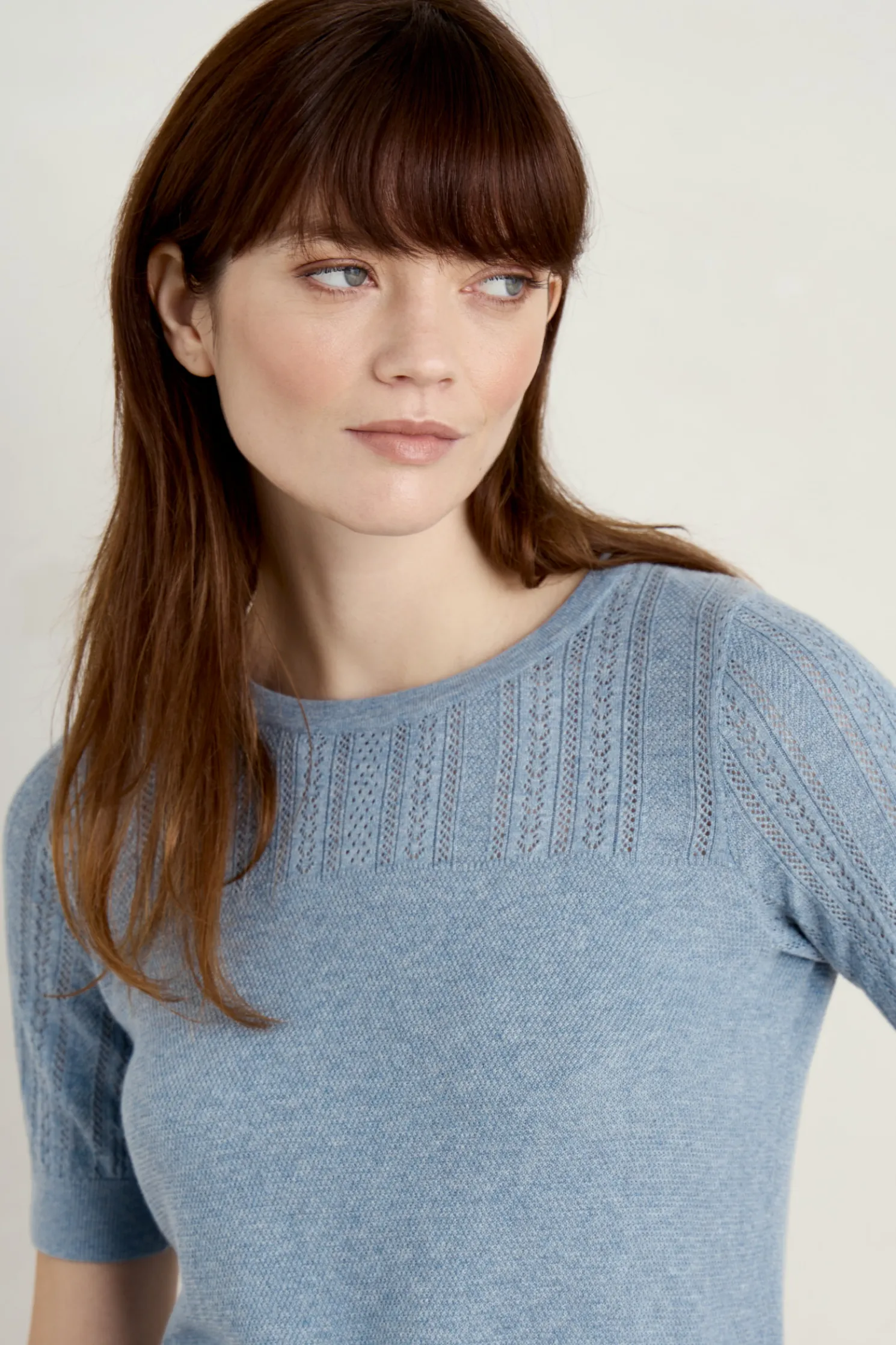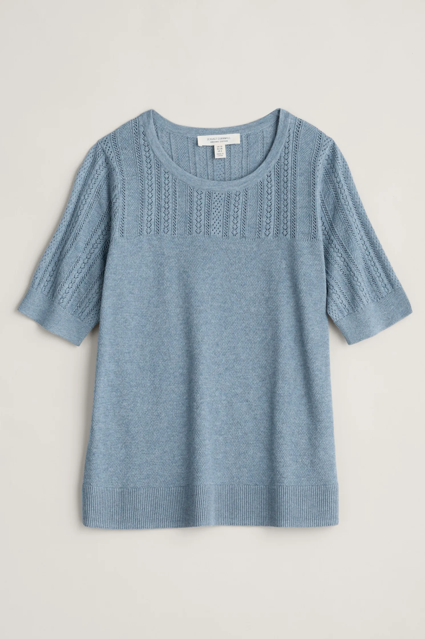 An Organic Cotton Knitted Top With A Delicate Stitch Detail Around The Yoke And Along The Sleeves. The Ribbed Cuffs And Hem Complement The Neat, Fitted Shape, And We Love This Style With Summer Crops.