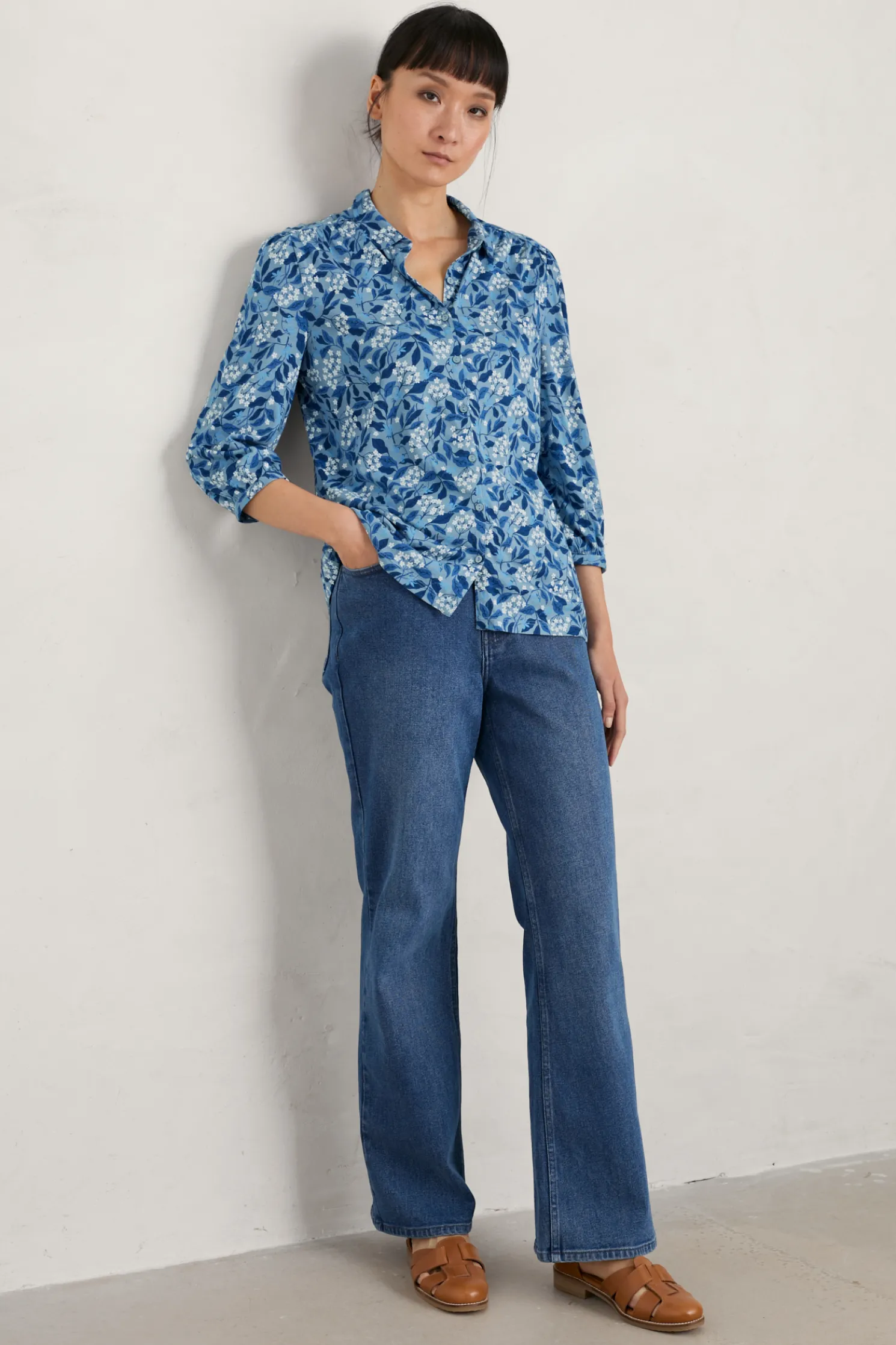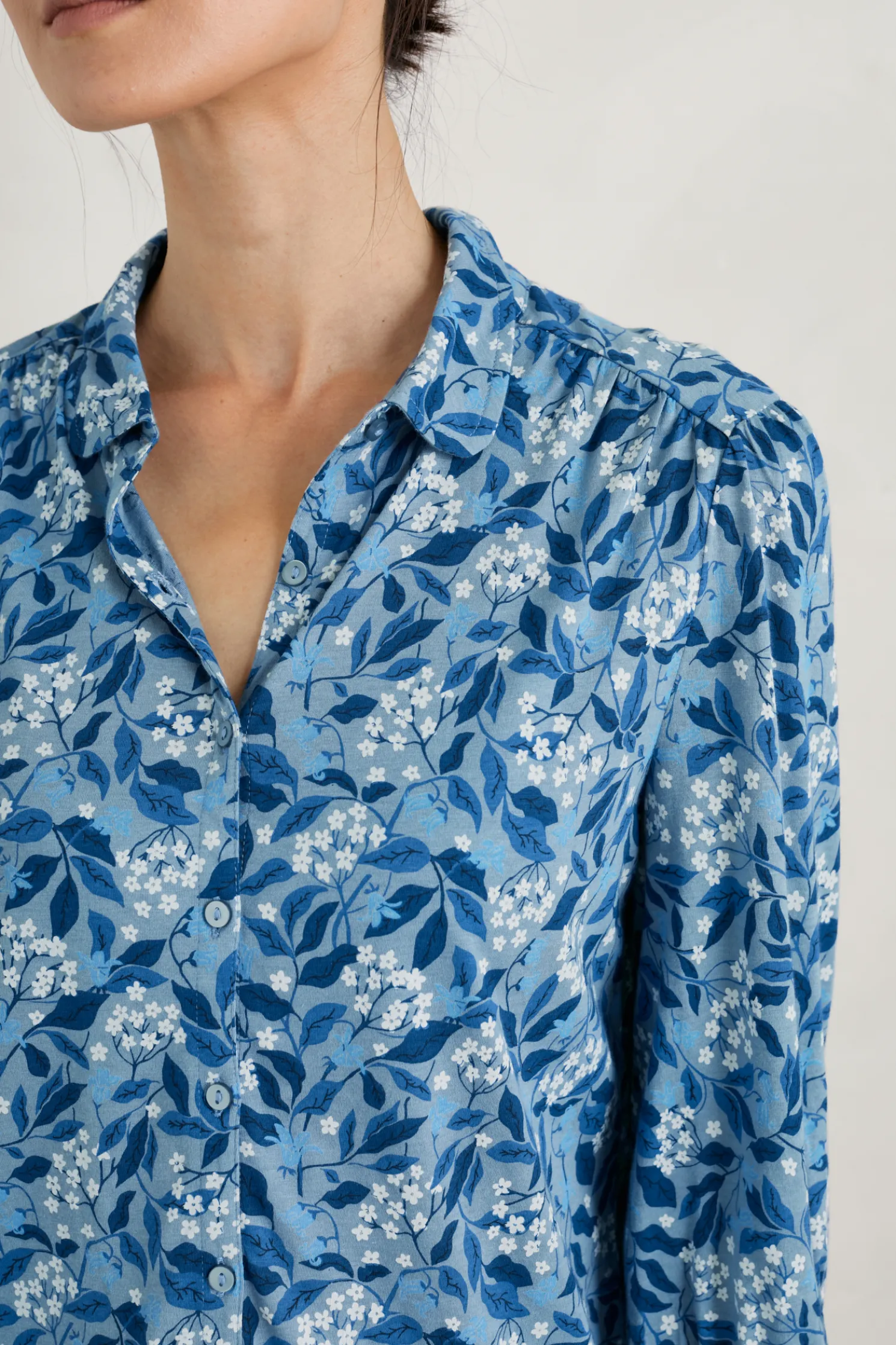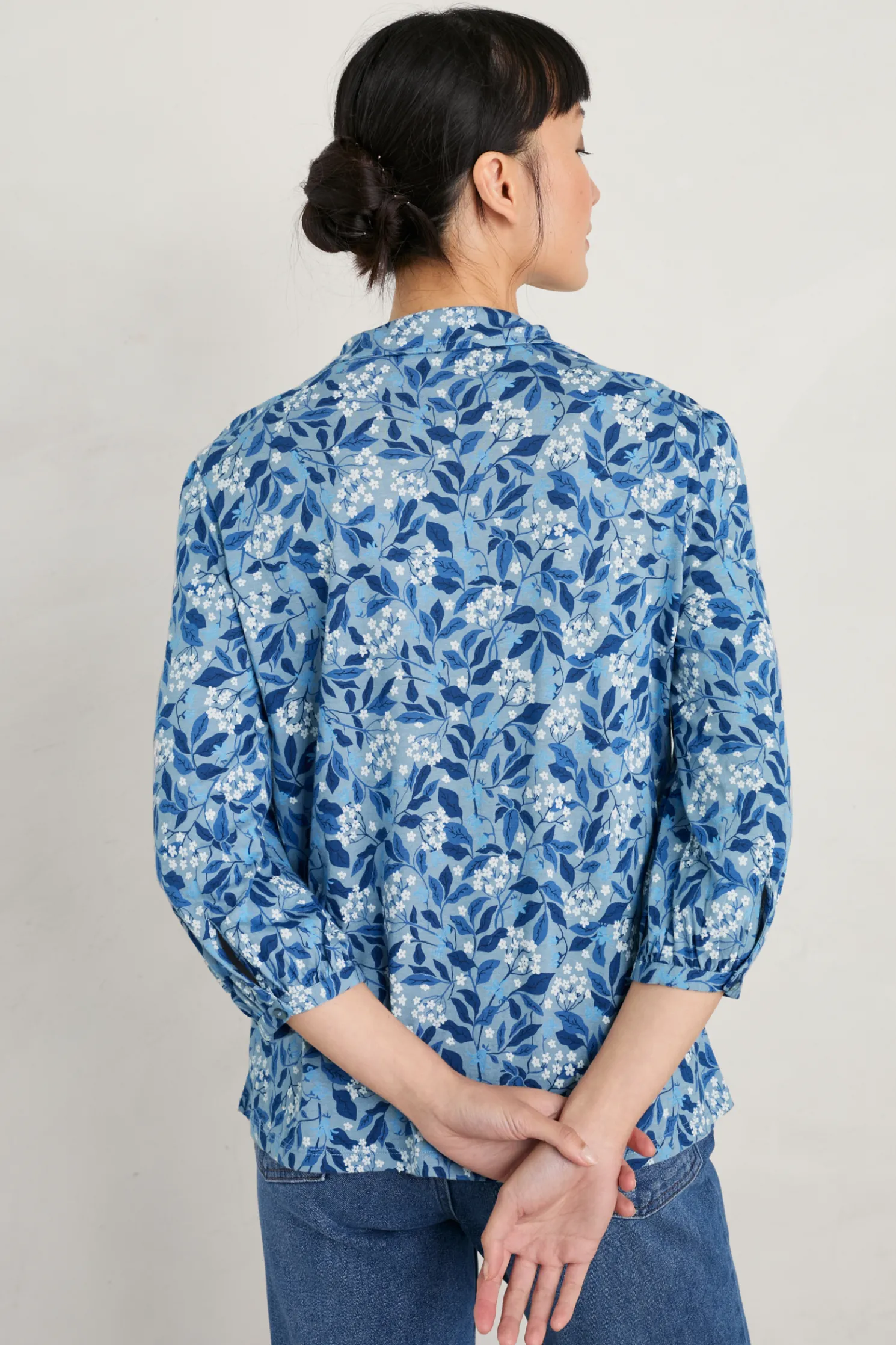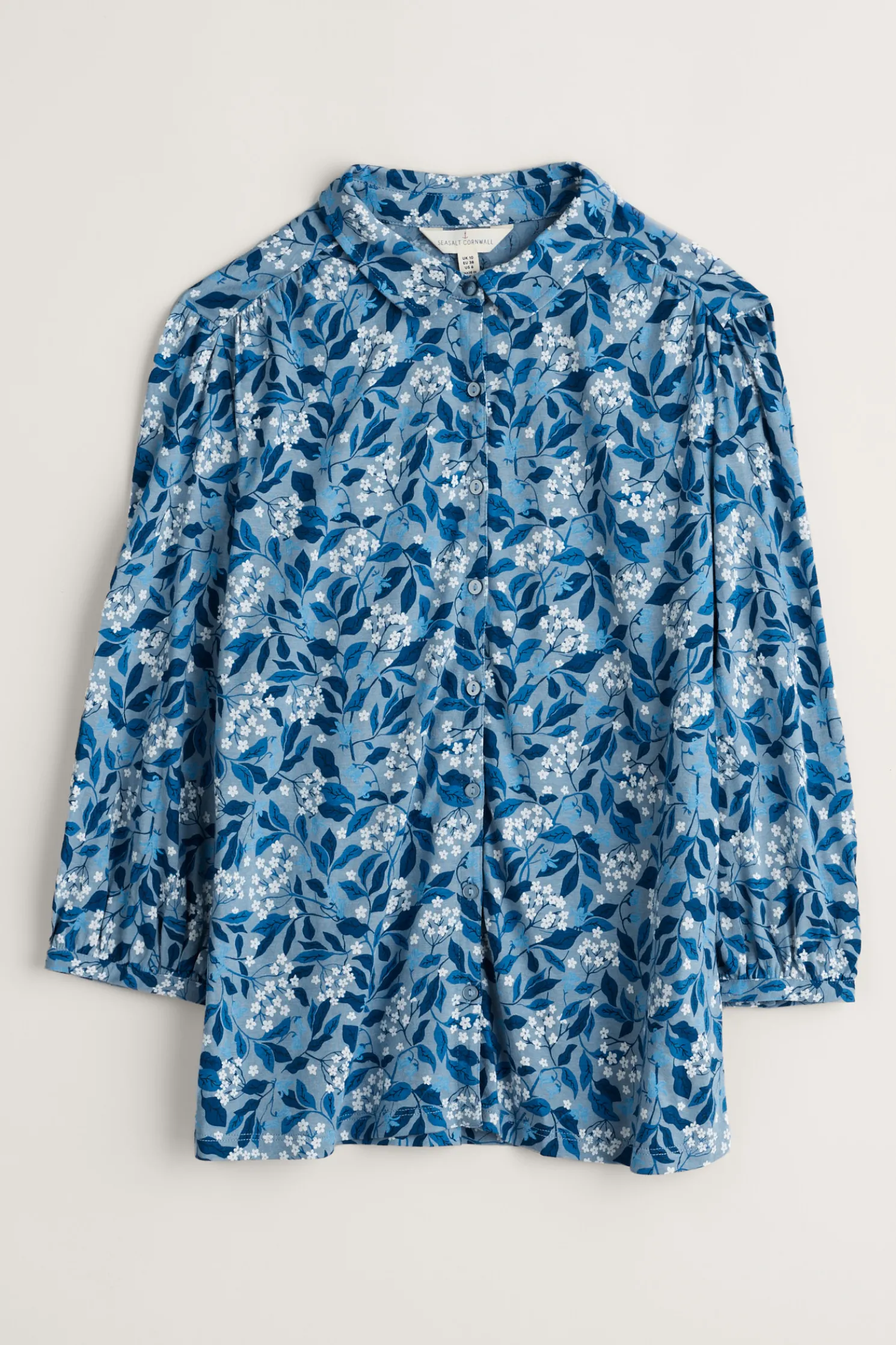 A Soft, Printed Button-Through Shirt With A Semi-Fitted Shape, Made From A Skimming Organic Cotton And Modal Blend Jersey. Gathers At The Cuffs And Shoulder Seams Give A Subtle Volume To Its Blouson Sleeves.