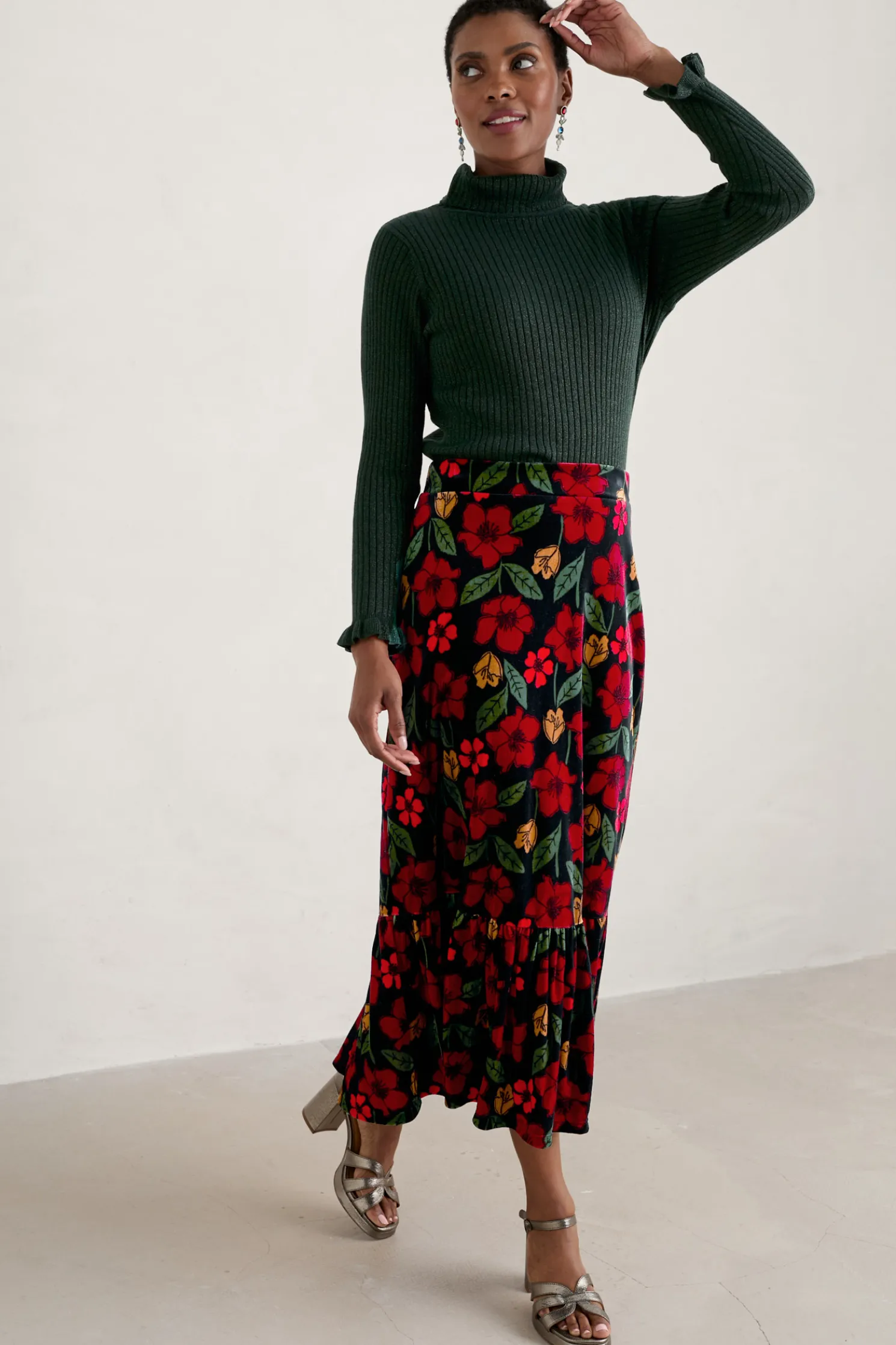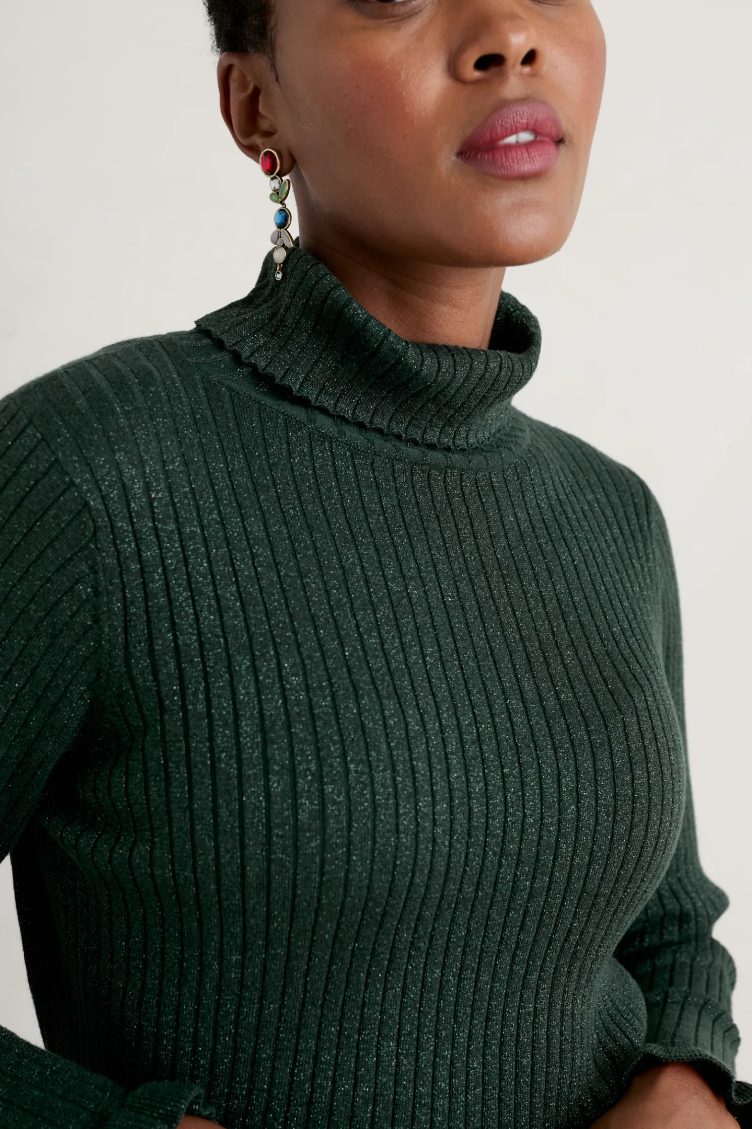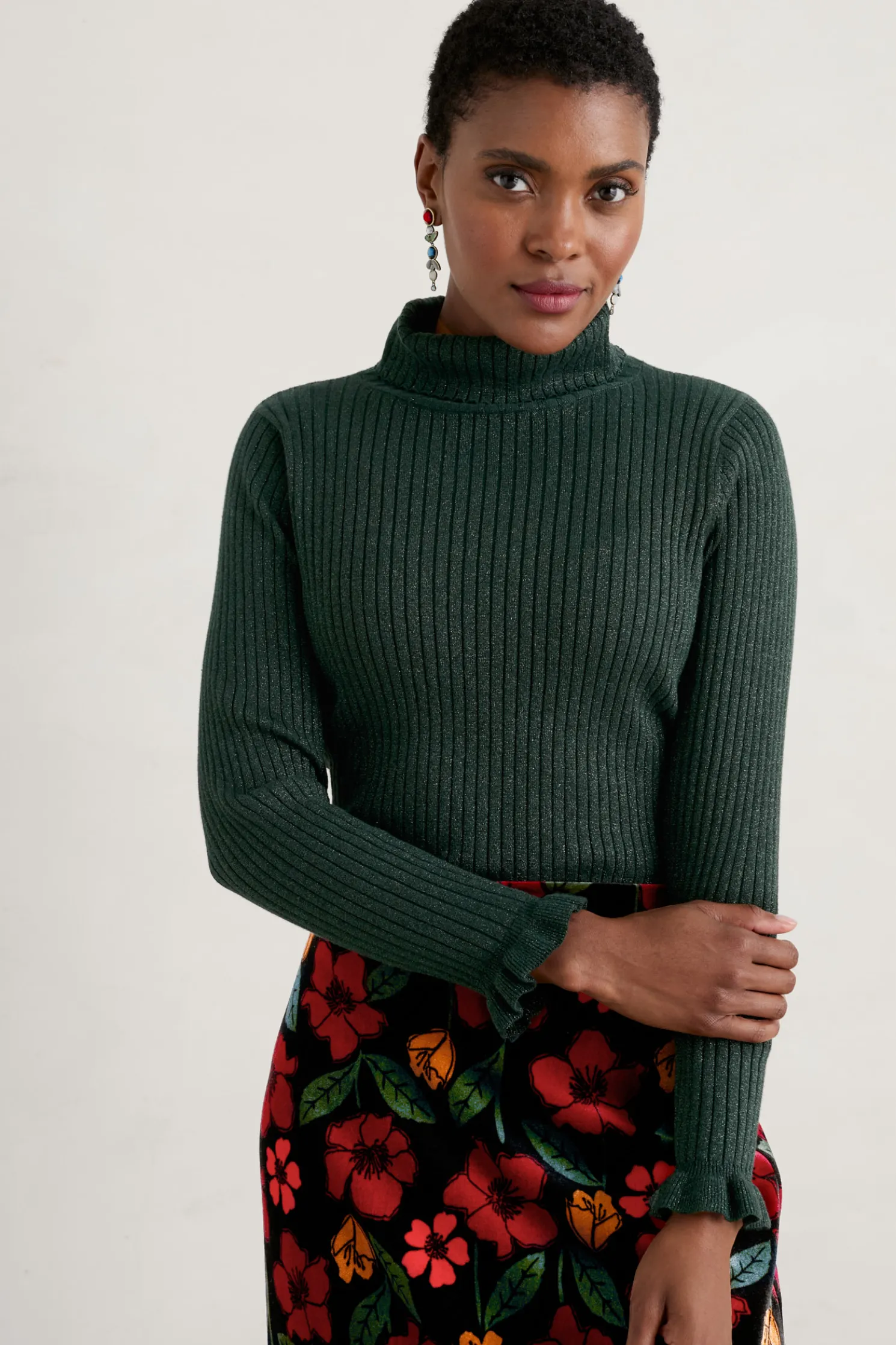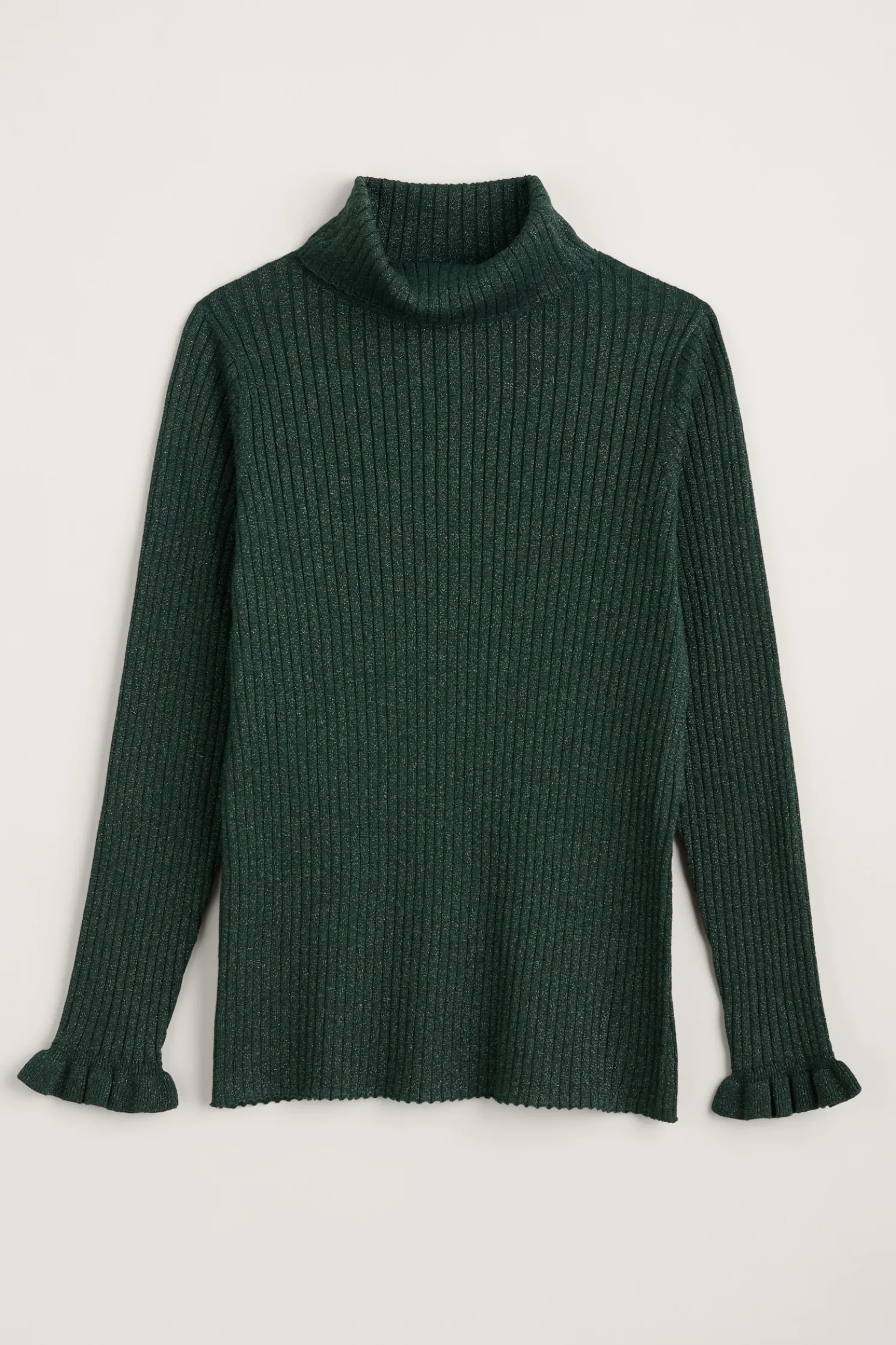 A Fitted Roll Neck Jumper With A Sparkly All-Over Rib Stitch And Playful Frilled Cuffs. We Love It With Jeans For Days In The Office, Or Tucked Into A Skirt To Add Festive Glimmer To Parties And Dinners.
