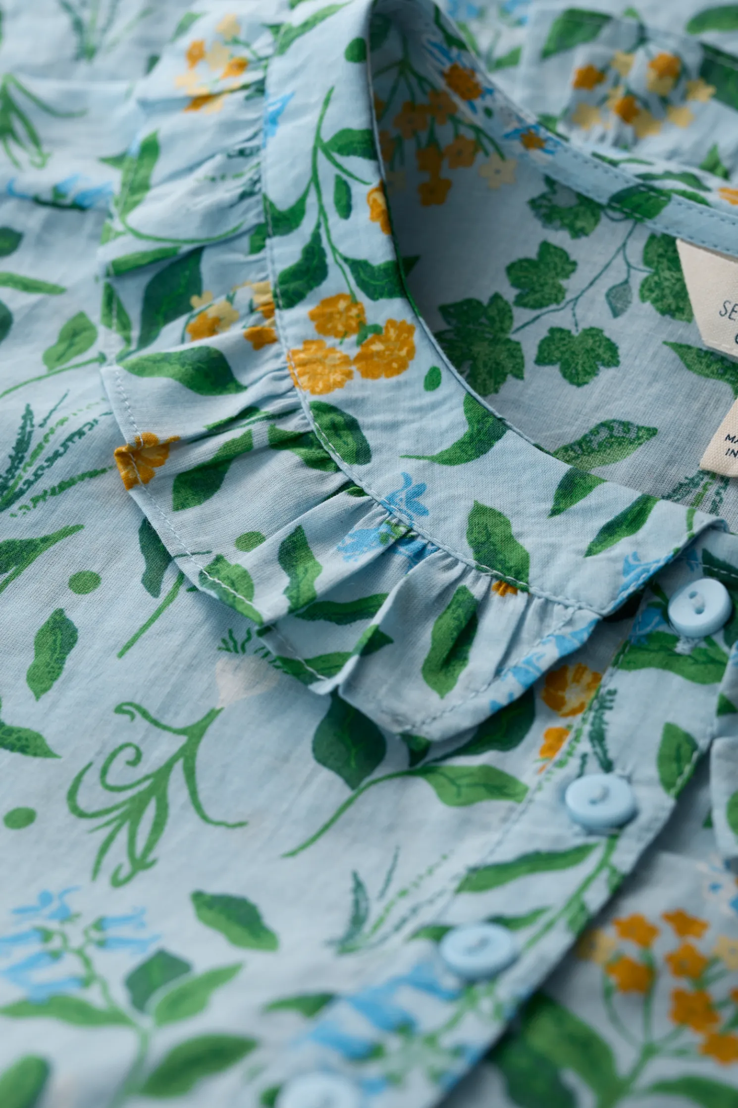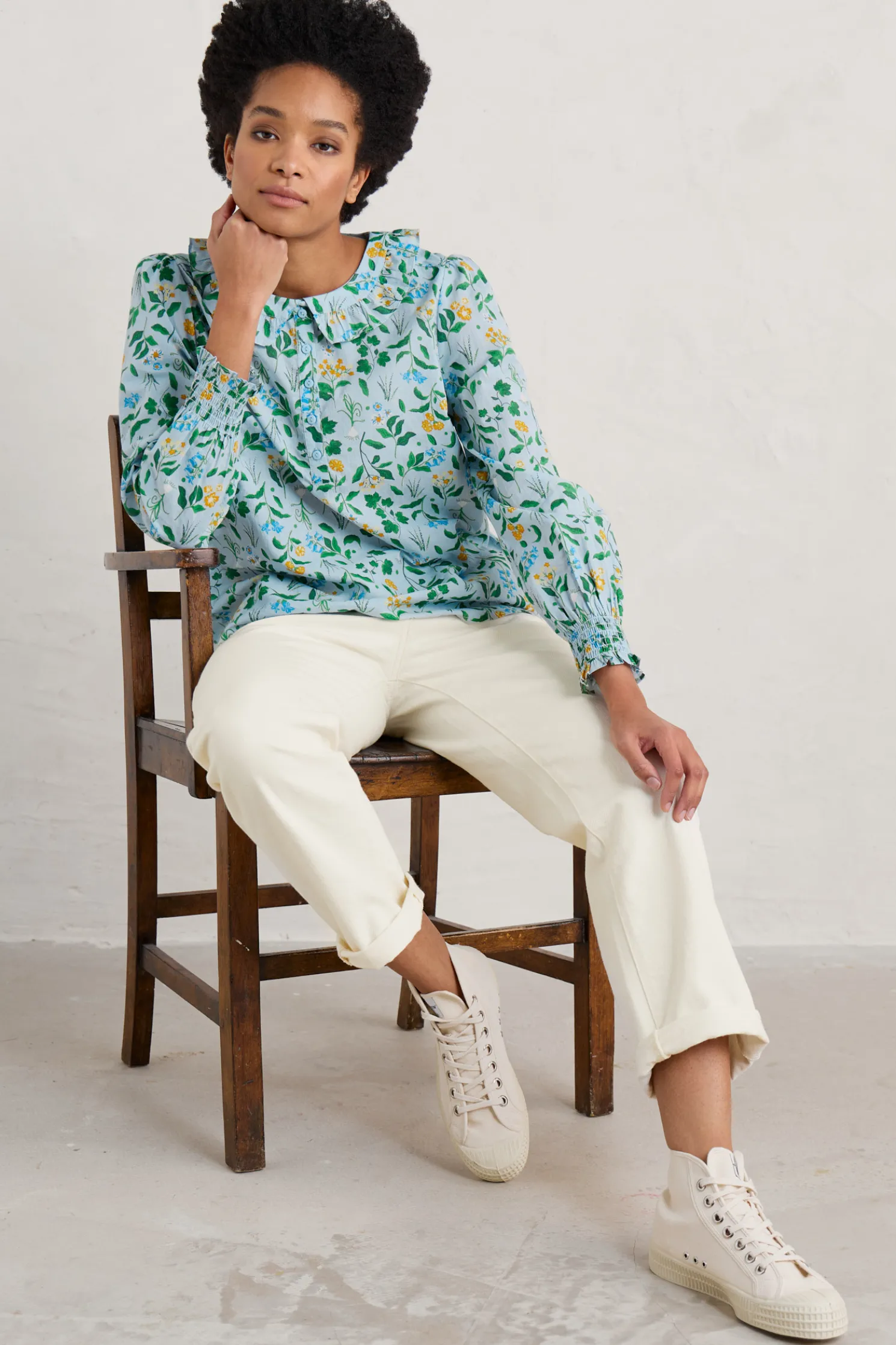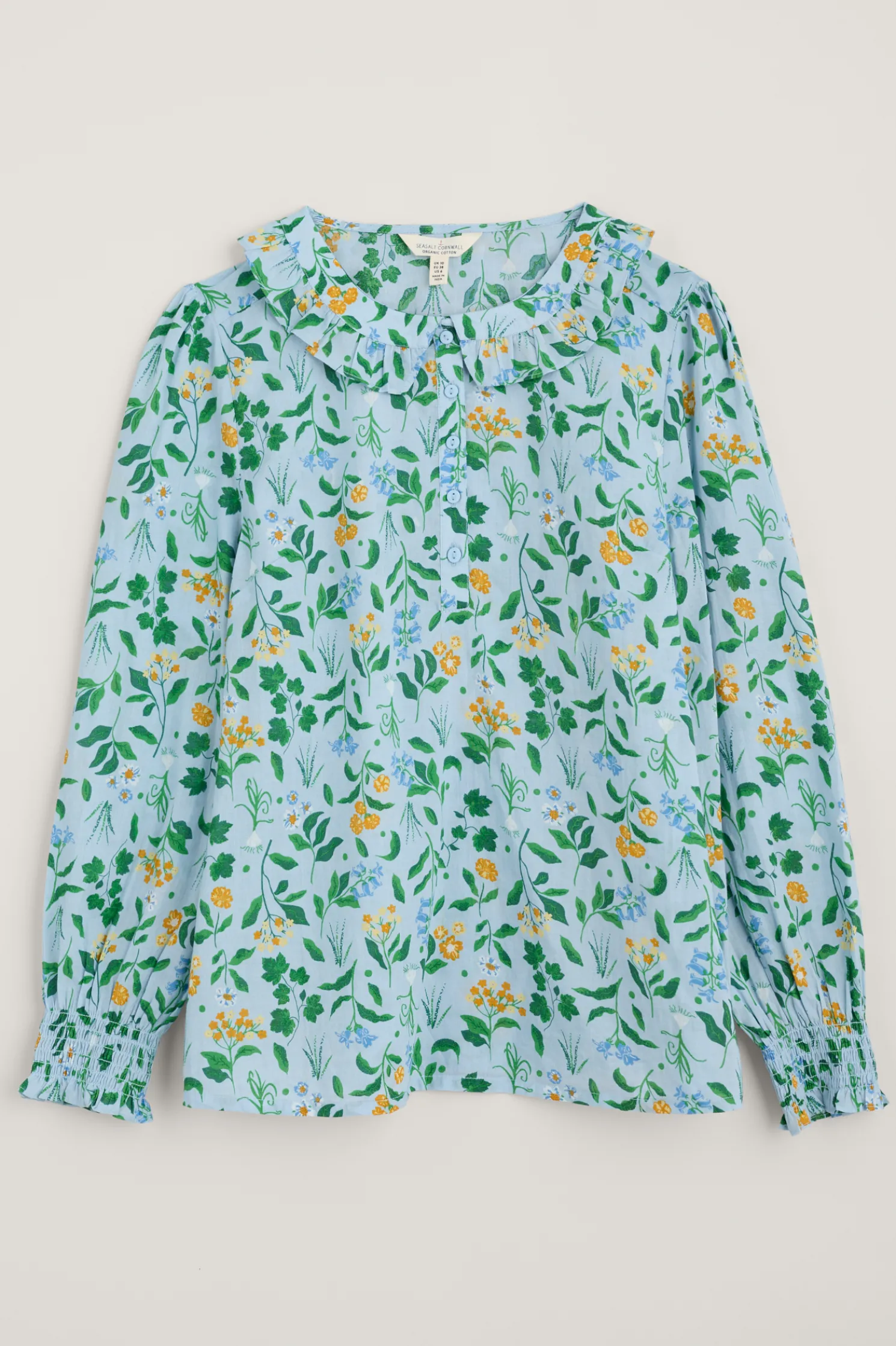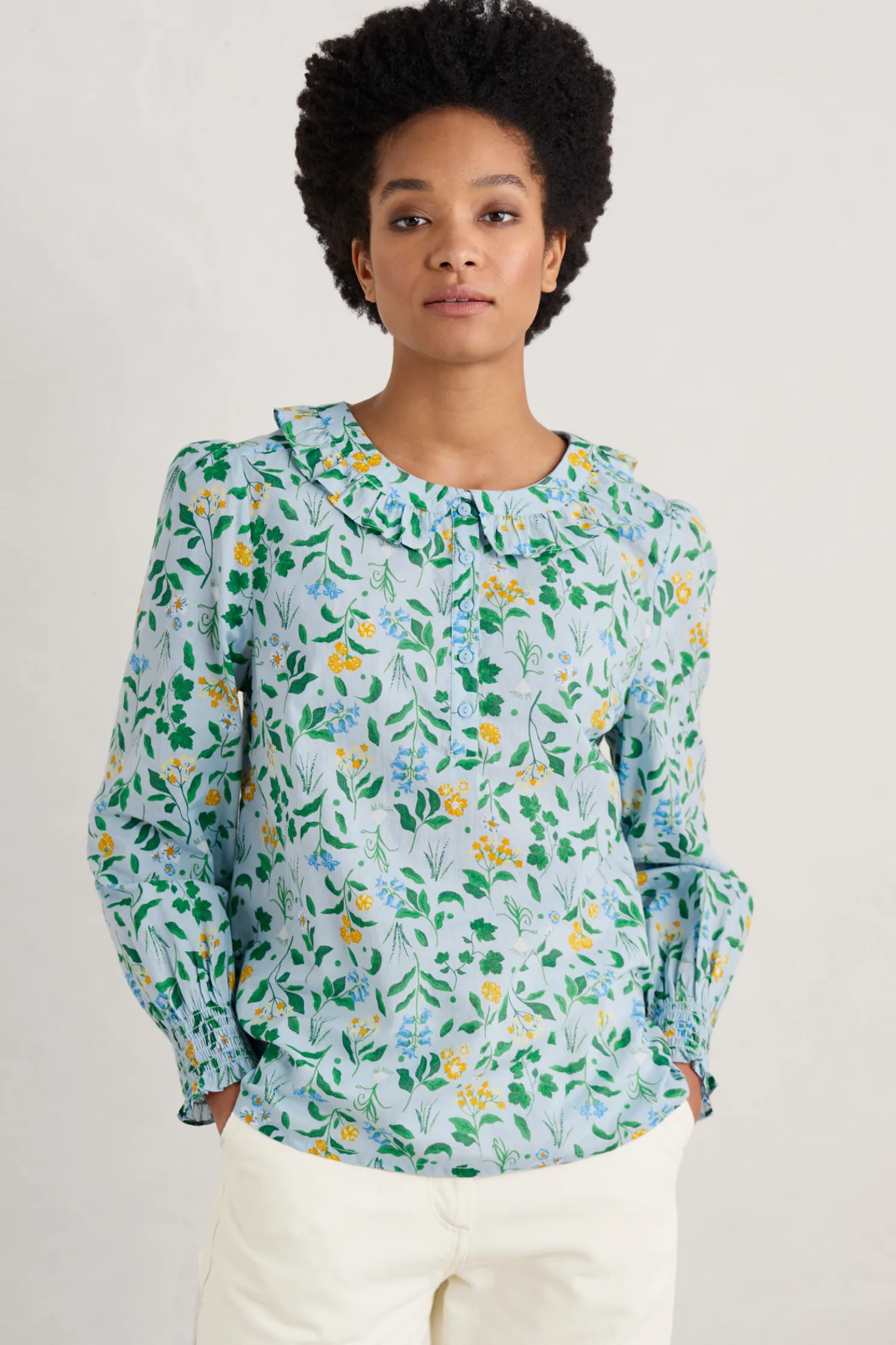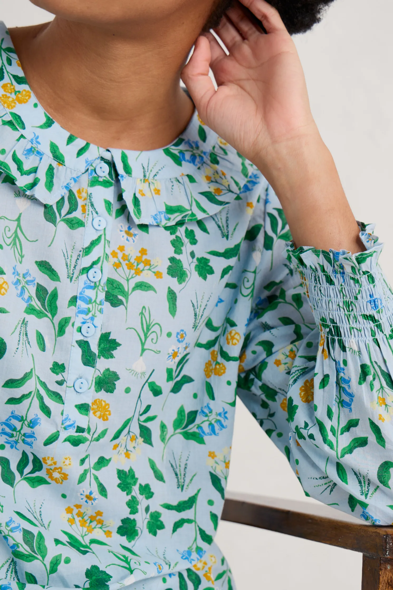 A Versatile Blouse With A Handcrafted Print, Frilled Collar And Shirred Cuffs. The Little Details Make It The Ideal Summer Update For Simple Crops And Shirts, And Add A Playful Elegance Under Pinafore Dresses And Dungarees.