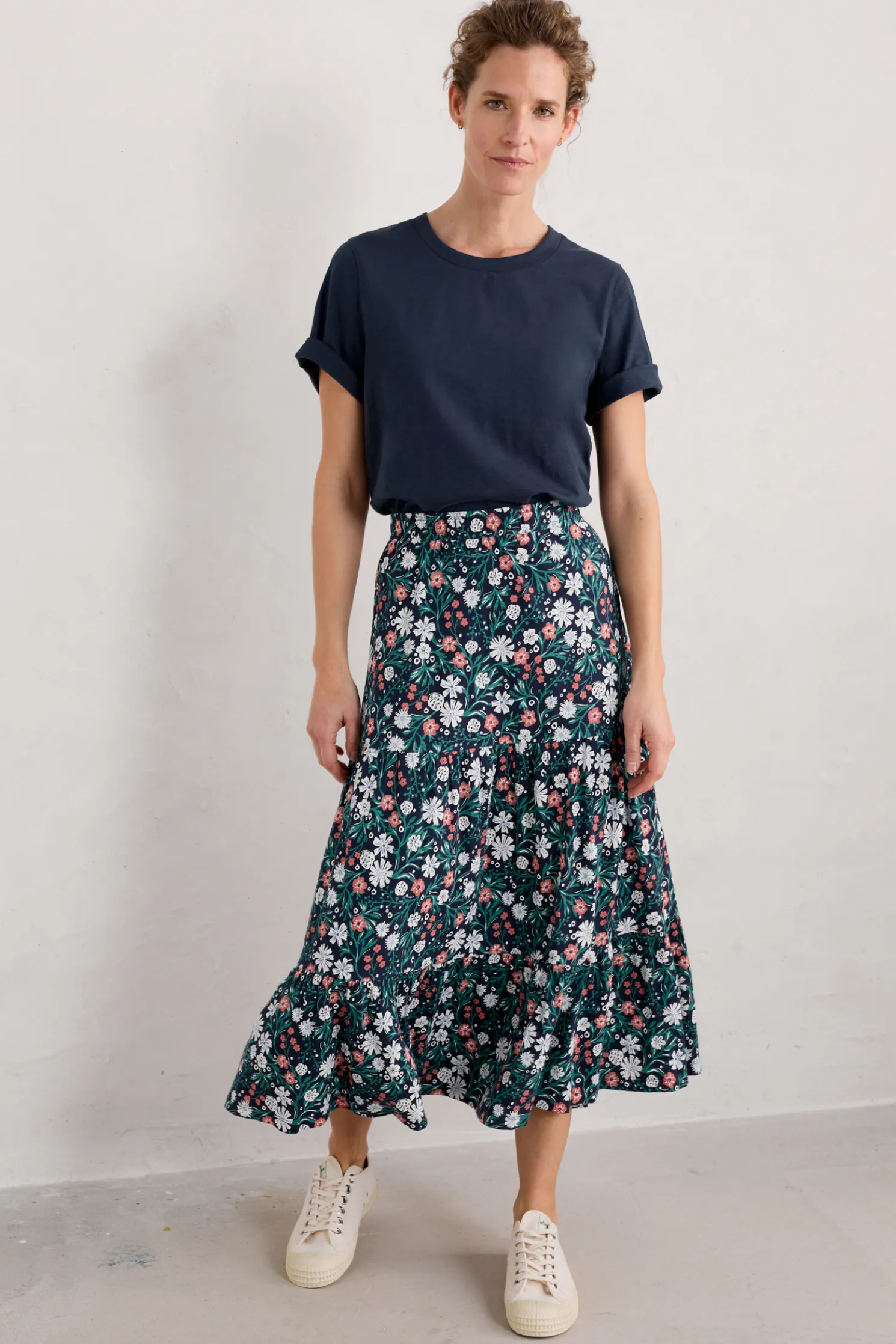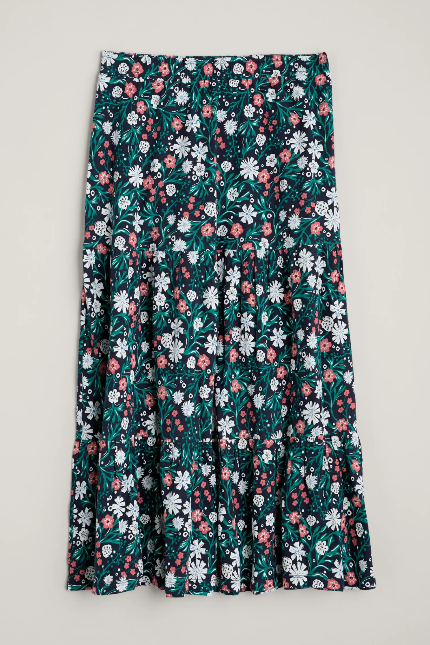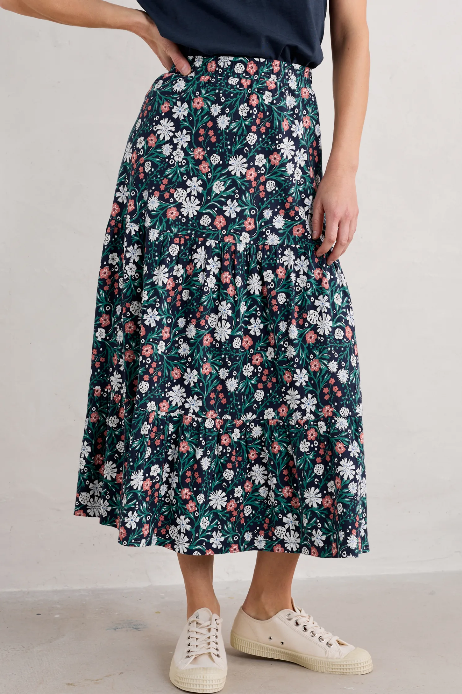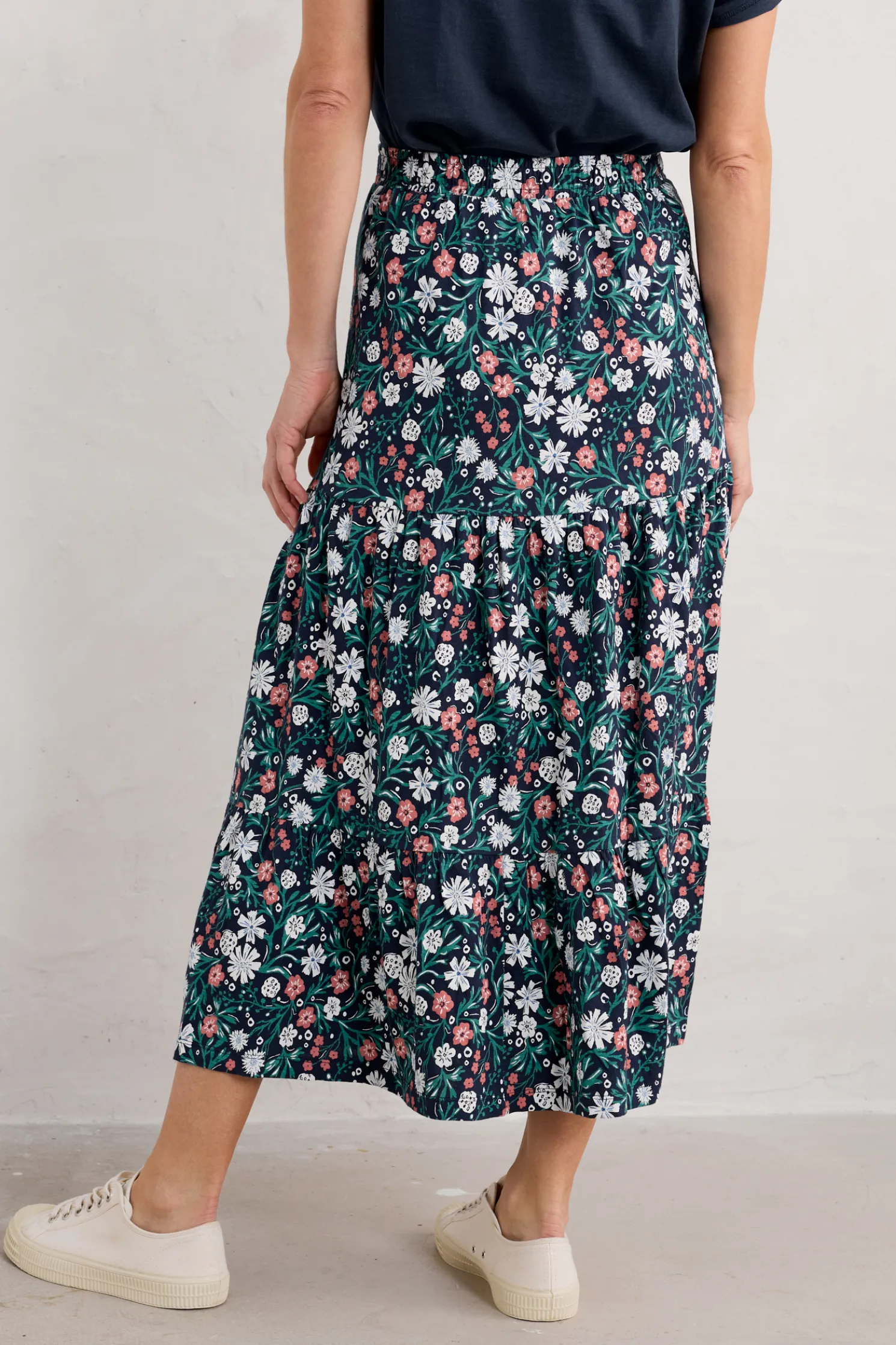A Floaty, Feminine Tiered Midi Skirt With Soft Gathers, Giving It A Gorgeous Swish. Made From Breathable, Easy To Wear Cotton Jersey, It Has A Delicate, Handcrafted Print. Team With A Plain T-Shirt Or Sailor Stripes And Sandals.