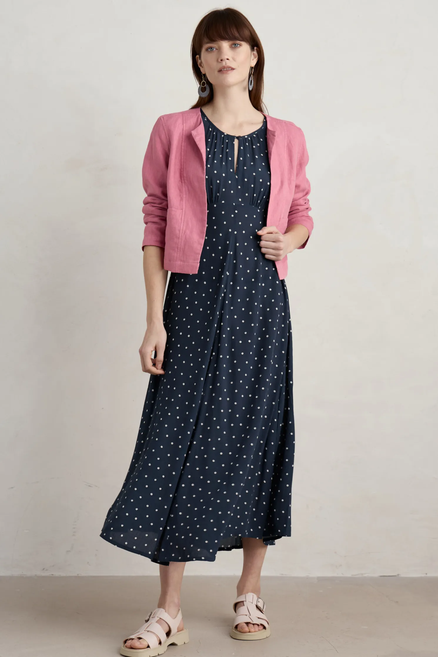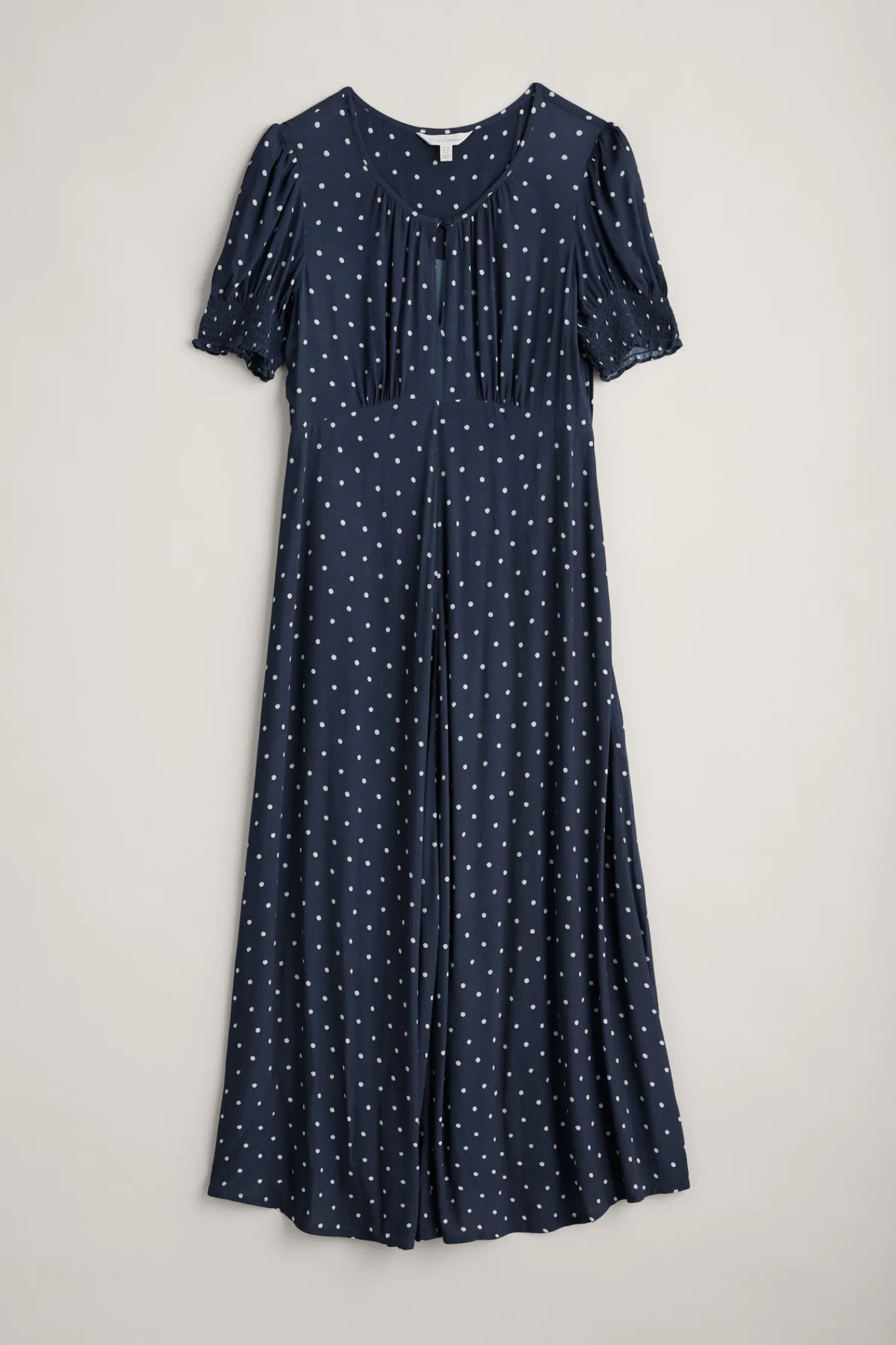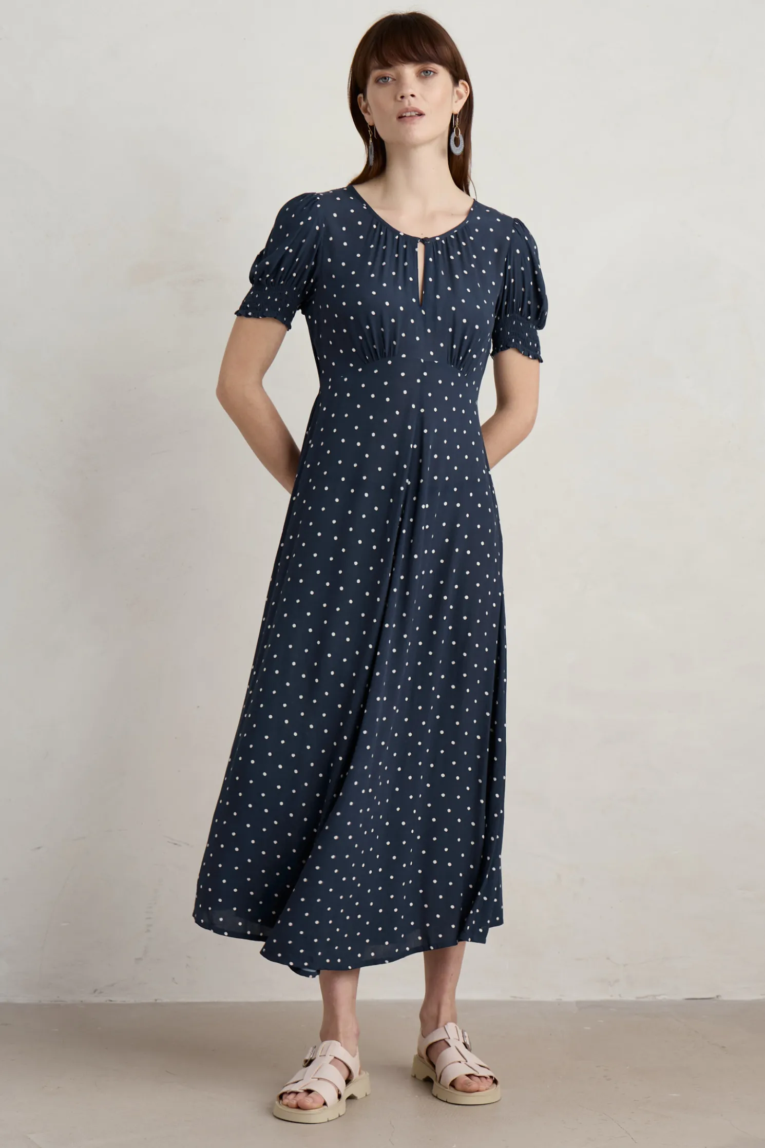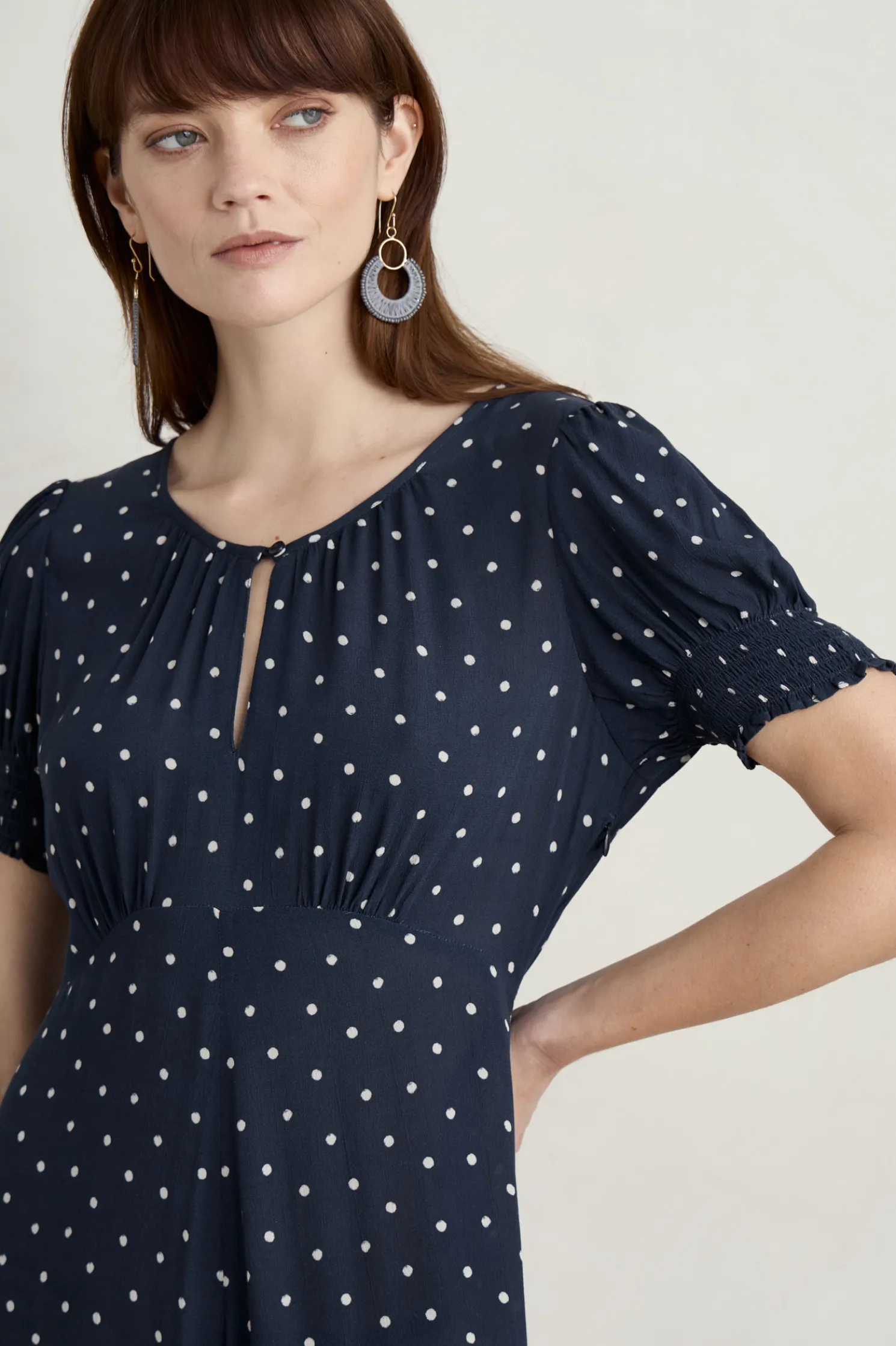 A Romantic, Vintage-Inspired Dress With A Skimming Empire Line Fit And Shirring At The Cuffs For A Subtle Blouson Sleeve. The Simple Scoop Neckline Has A Deep Notch Detail With A Button Fastening.