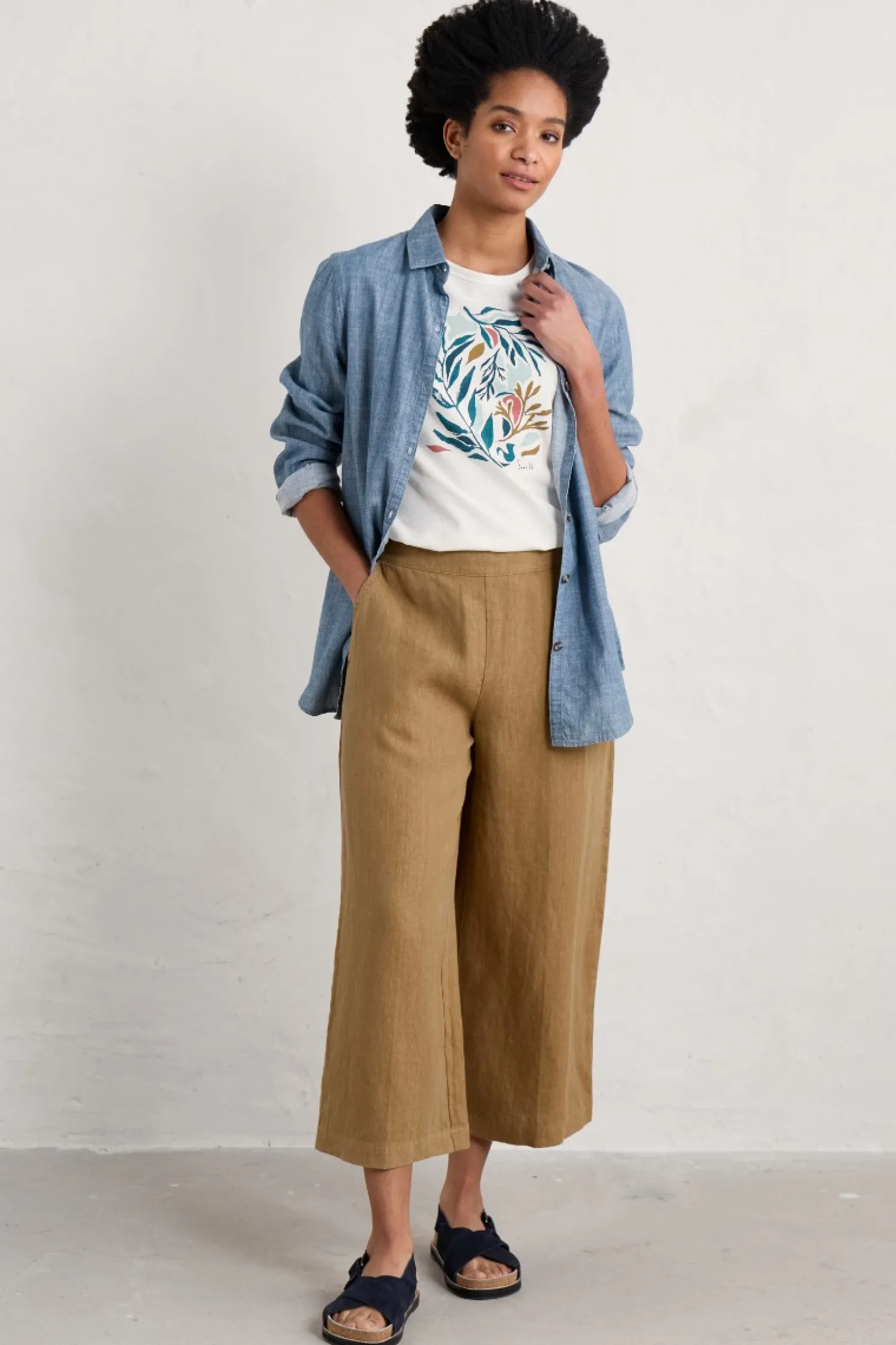 A Graphic T-Shirt Inspired By Our Summer On The Isles Of Scilly. This Short-Sleeved Top Is Made From Soft Organic Cotton With An Abstract Design Depicting Waves And The Island Sunshine. We Love It With Wide Leg Culottes, Leather Sandals And A Rustic Basket Bag.