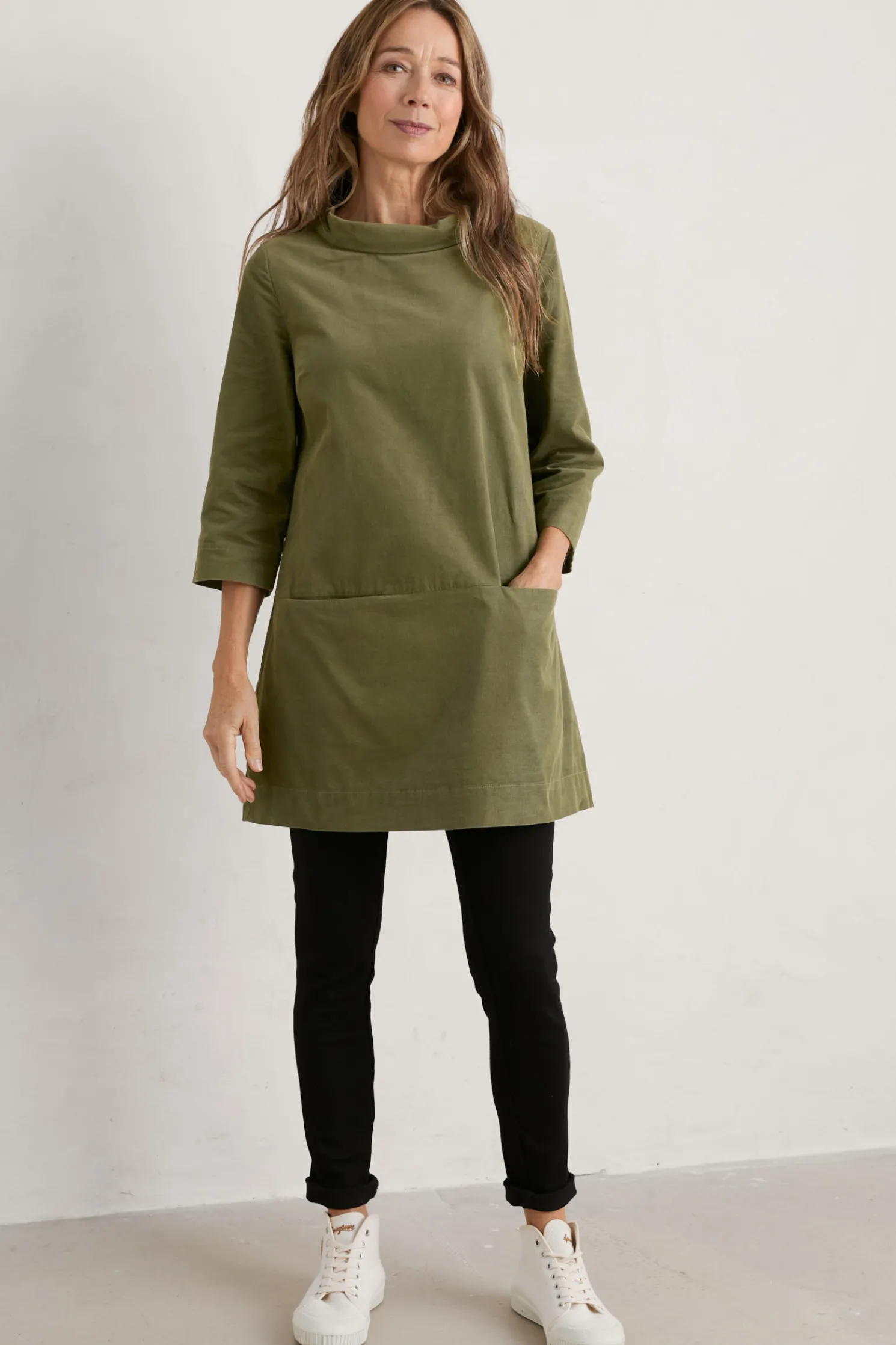 Our Sail By The Stars Tunic Is Made From Textured Cotton Needlecord Lined In Recycled Polyester. Featuring A Flattering Hepburn Neckline And Finished With 3/4 Length Sleeves And Pockets In The Horizontal Front Seam. We Love This A-Line Tunic With Our Soft Denim Jeggings And Stylish Leather Boots.