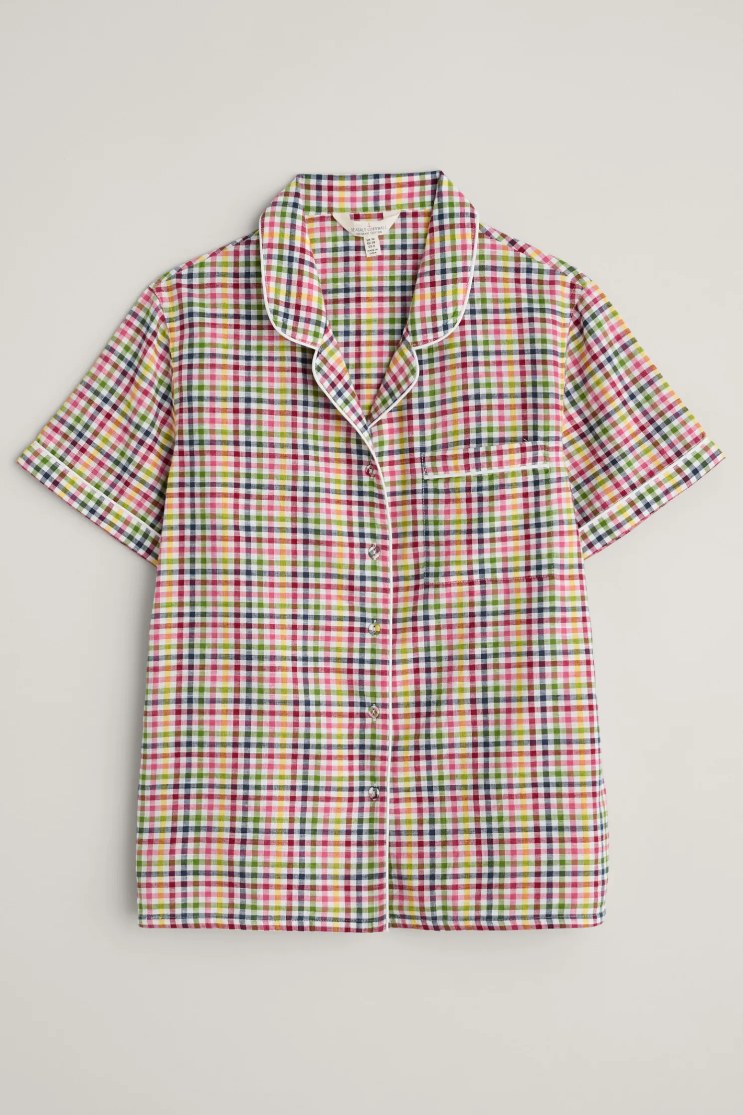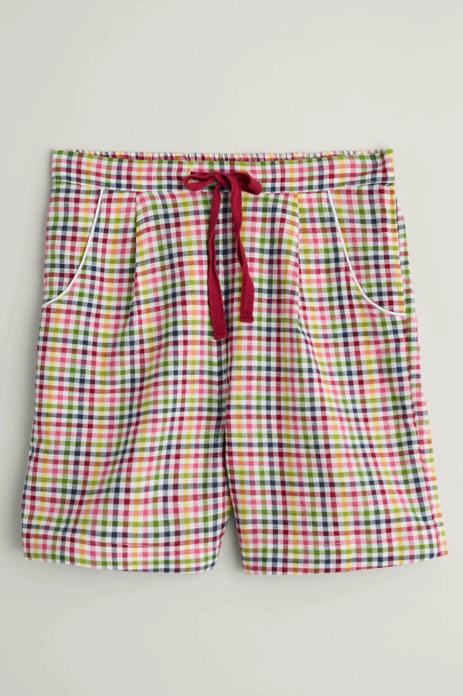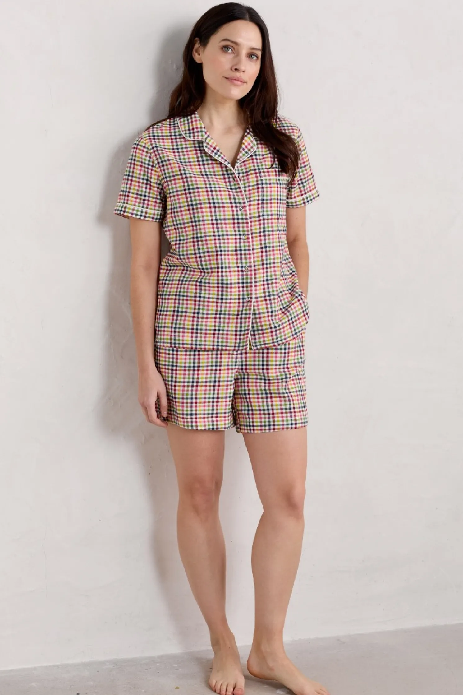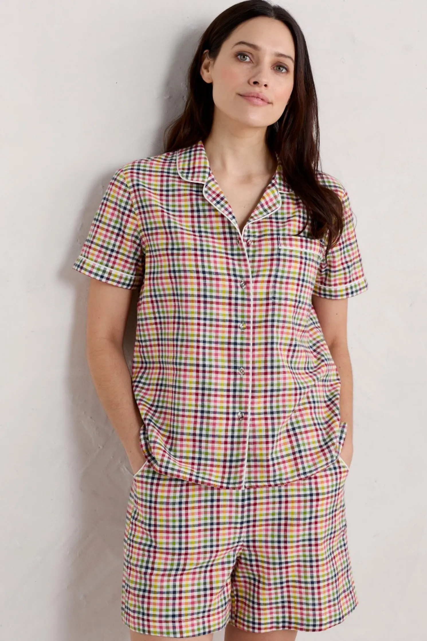 A Summer Pyjama Set Made From Comfortable, Breathable Organic Cotton With A Playful Yarn-Dyed Check. The Short-Sleeve Shirt Top Has A Classic Collar And Dipped Hem, And The Shorts Have Handy Pockets And An Elasticated Waist.
