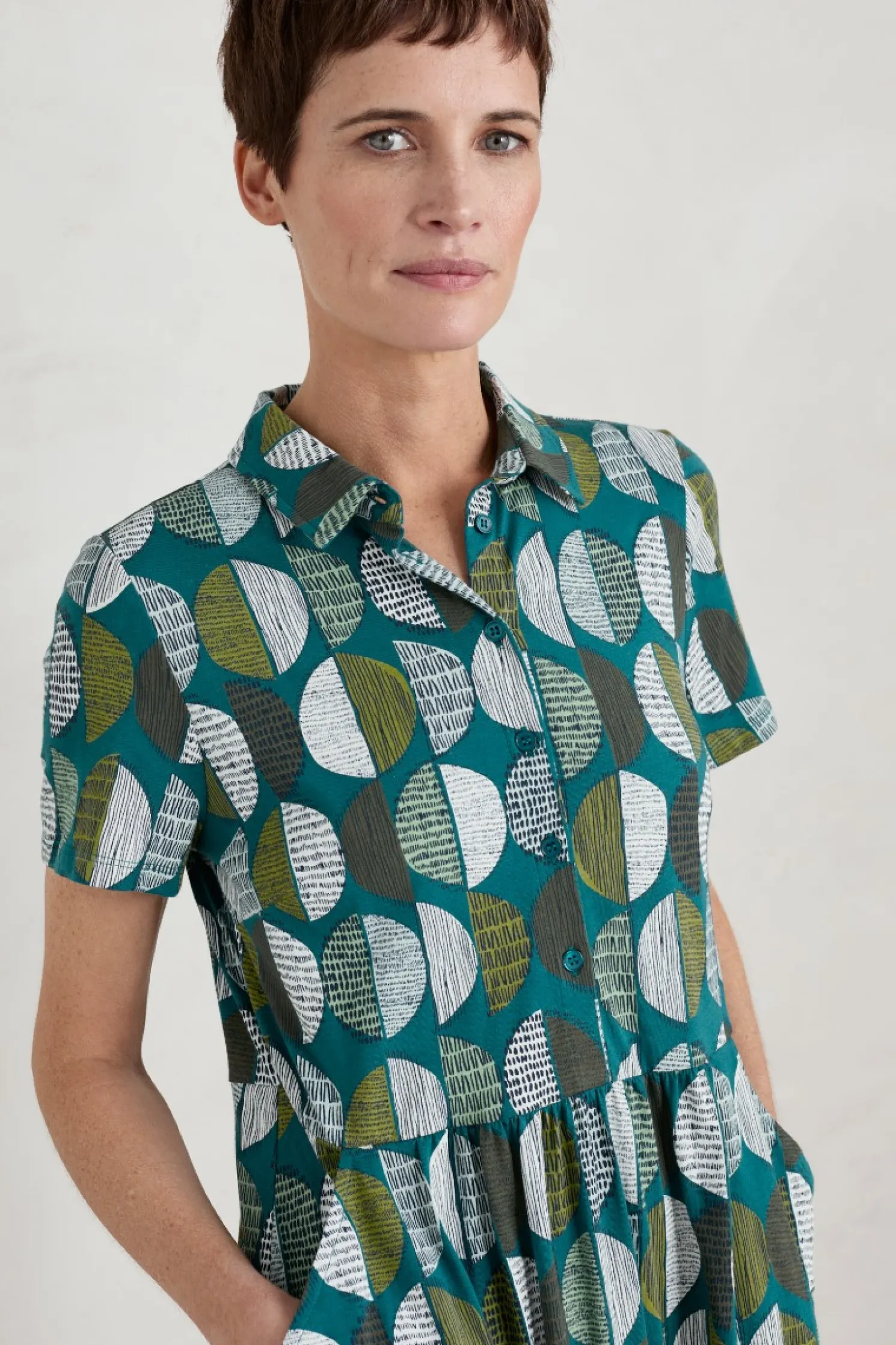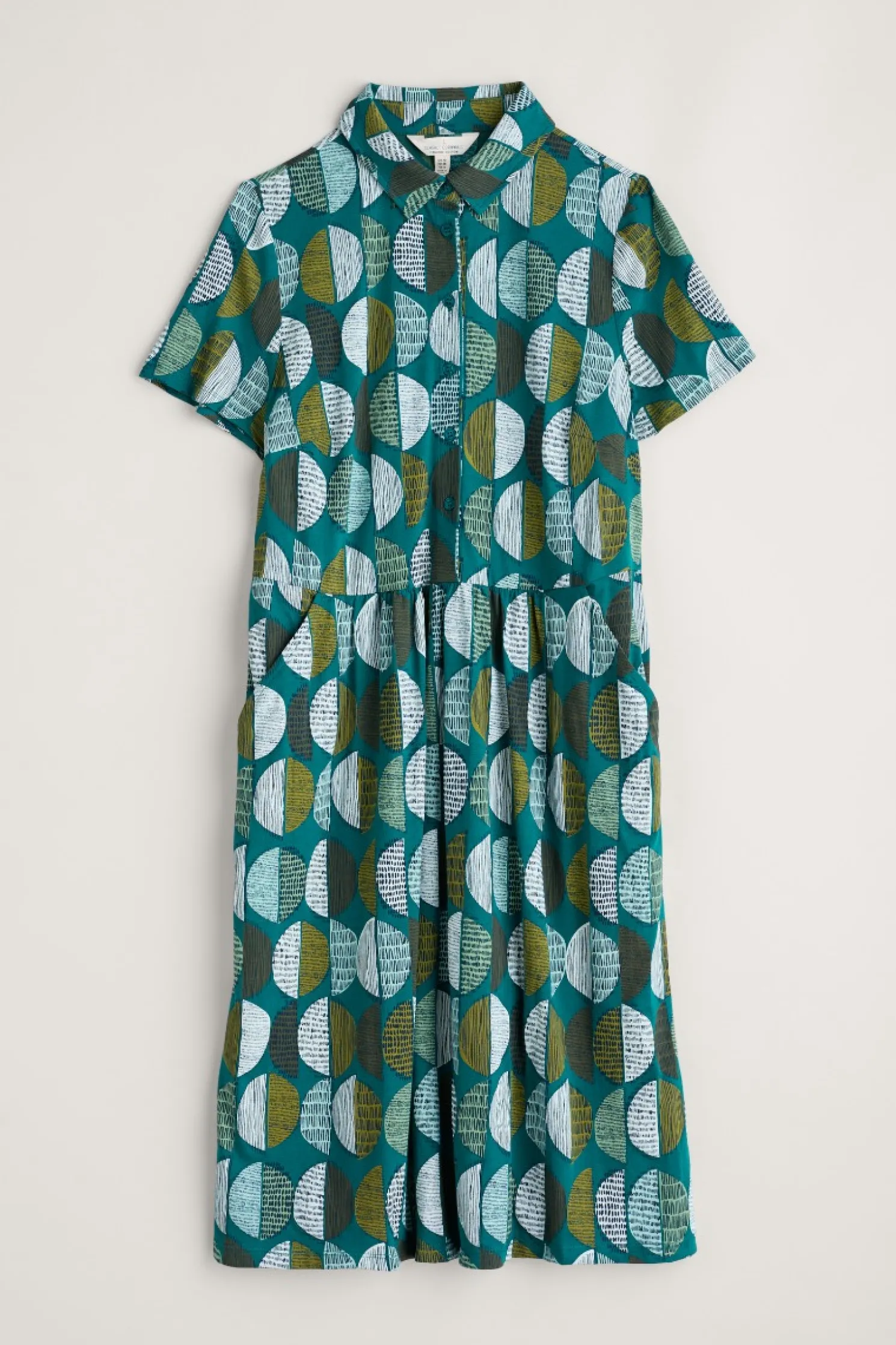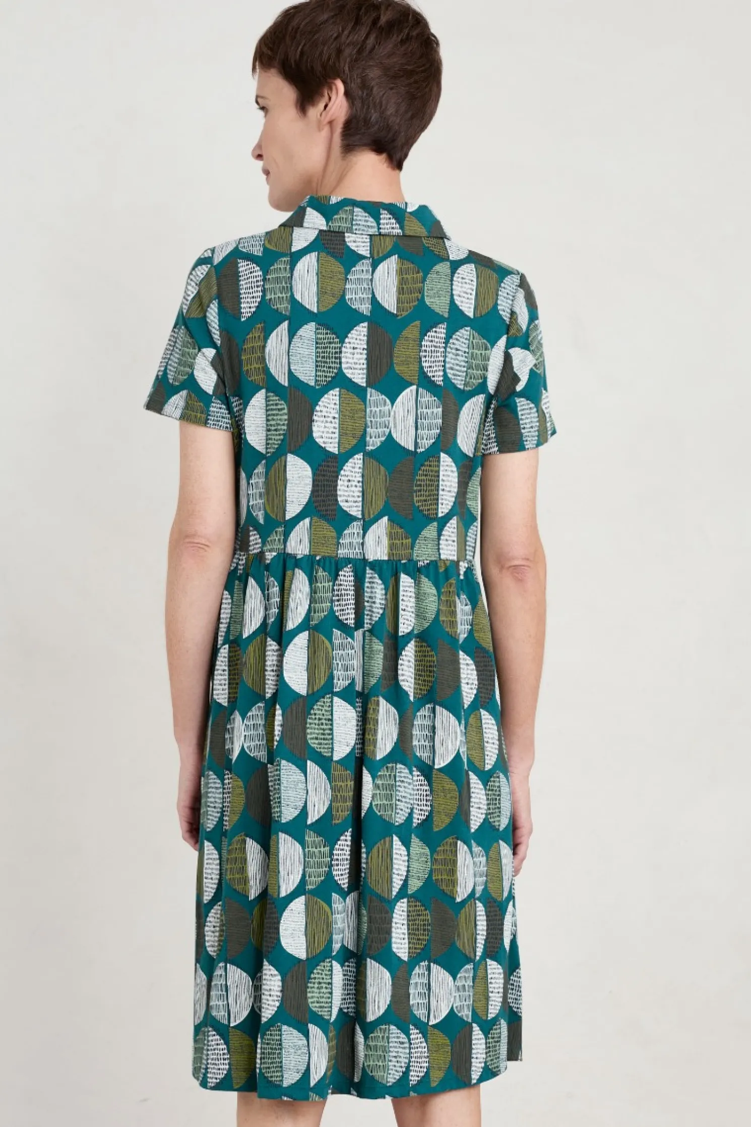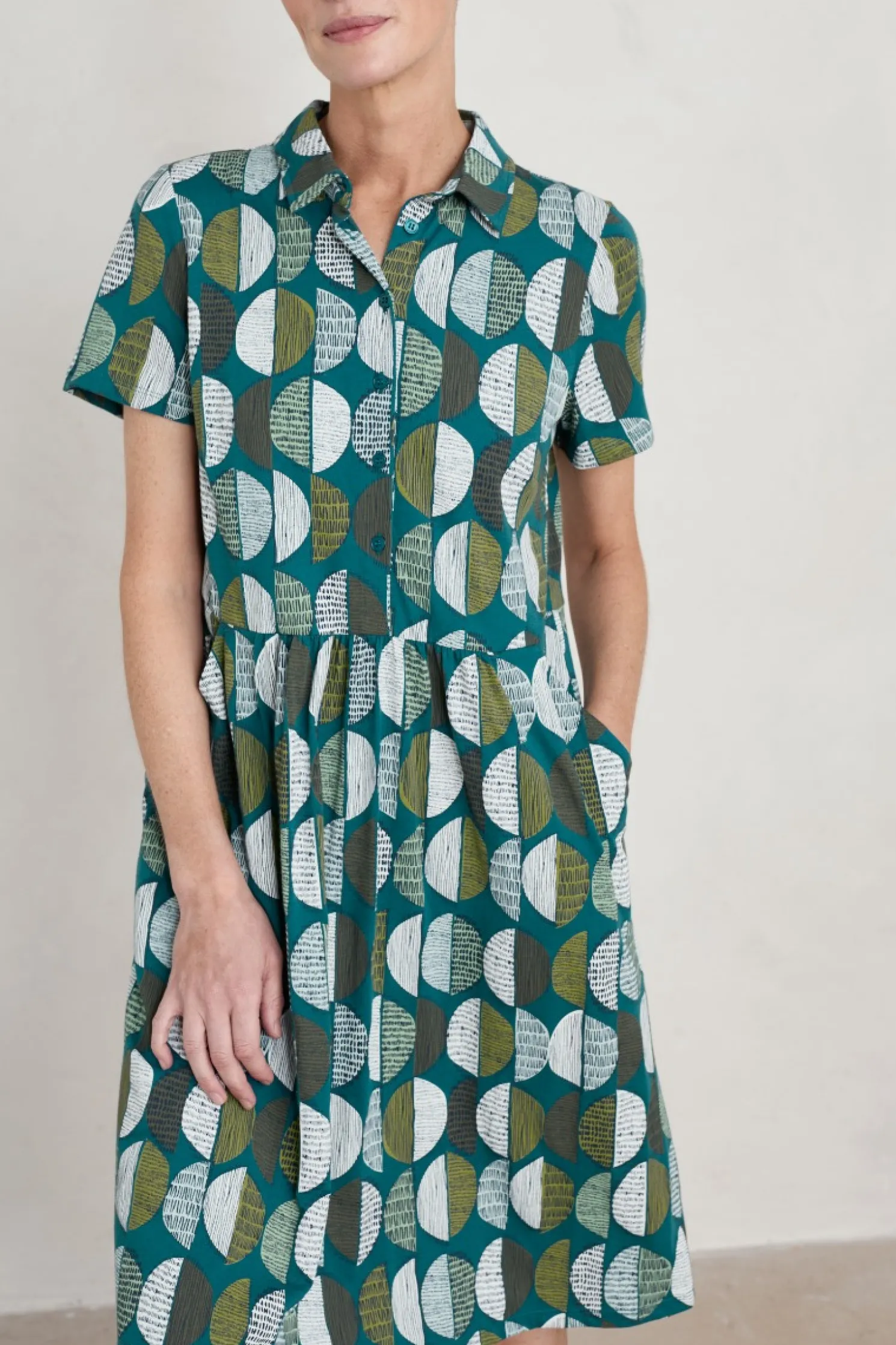 An Easy Dress For Long Summer Days. Soft And Breathable Organic Cotton Jersey Gives A Casual Fit To The Classic Shirt-Style Button Up Front And Curved Waist Seam With Gentle Gathers. Finished With Handy Side Seam Pockets.