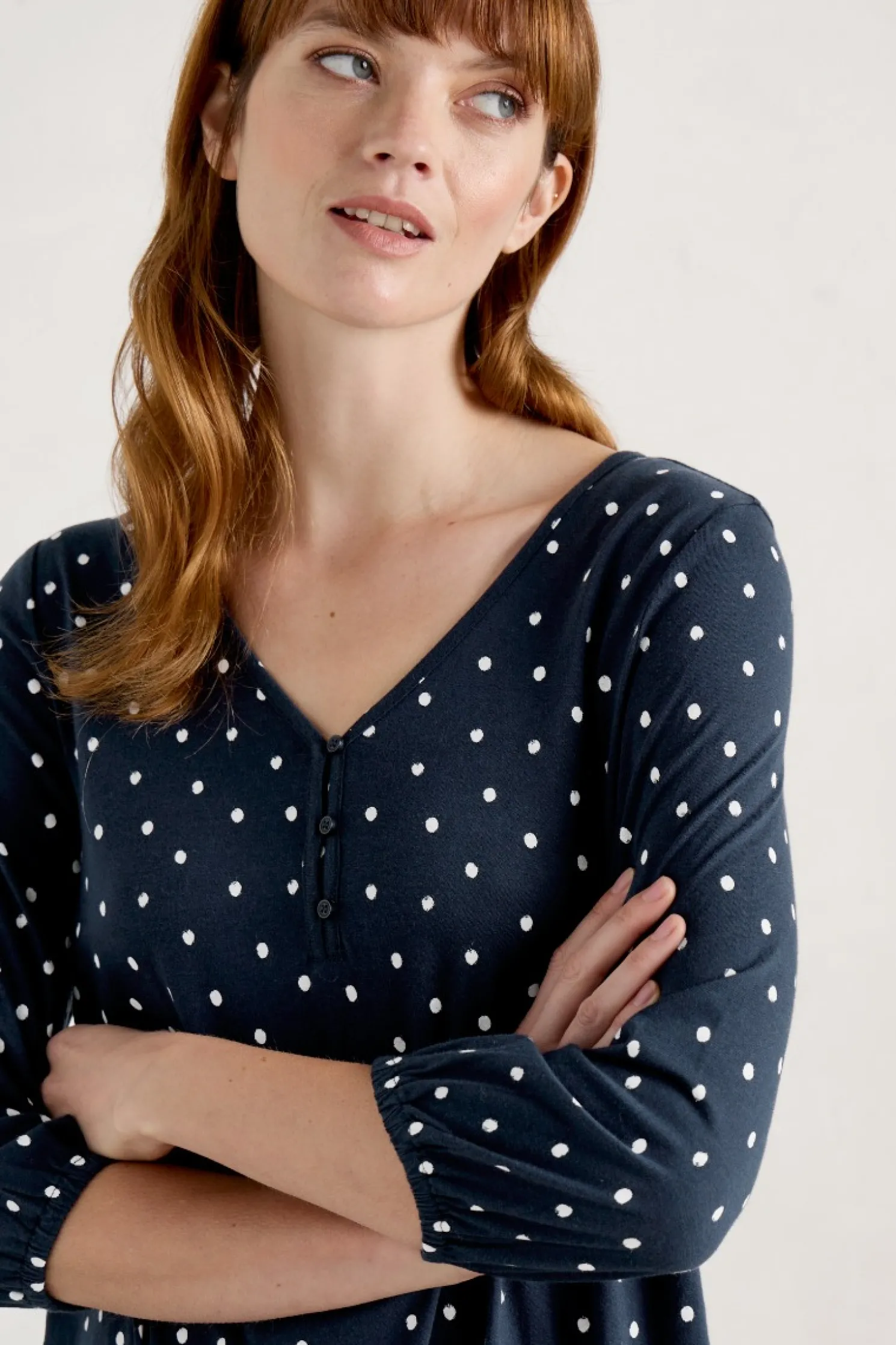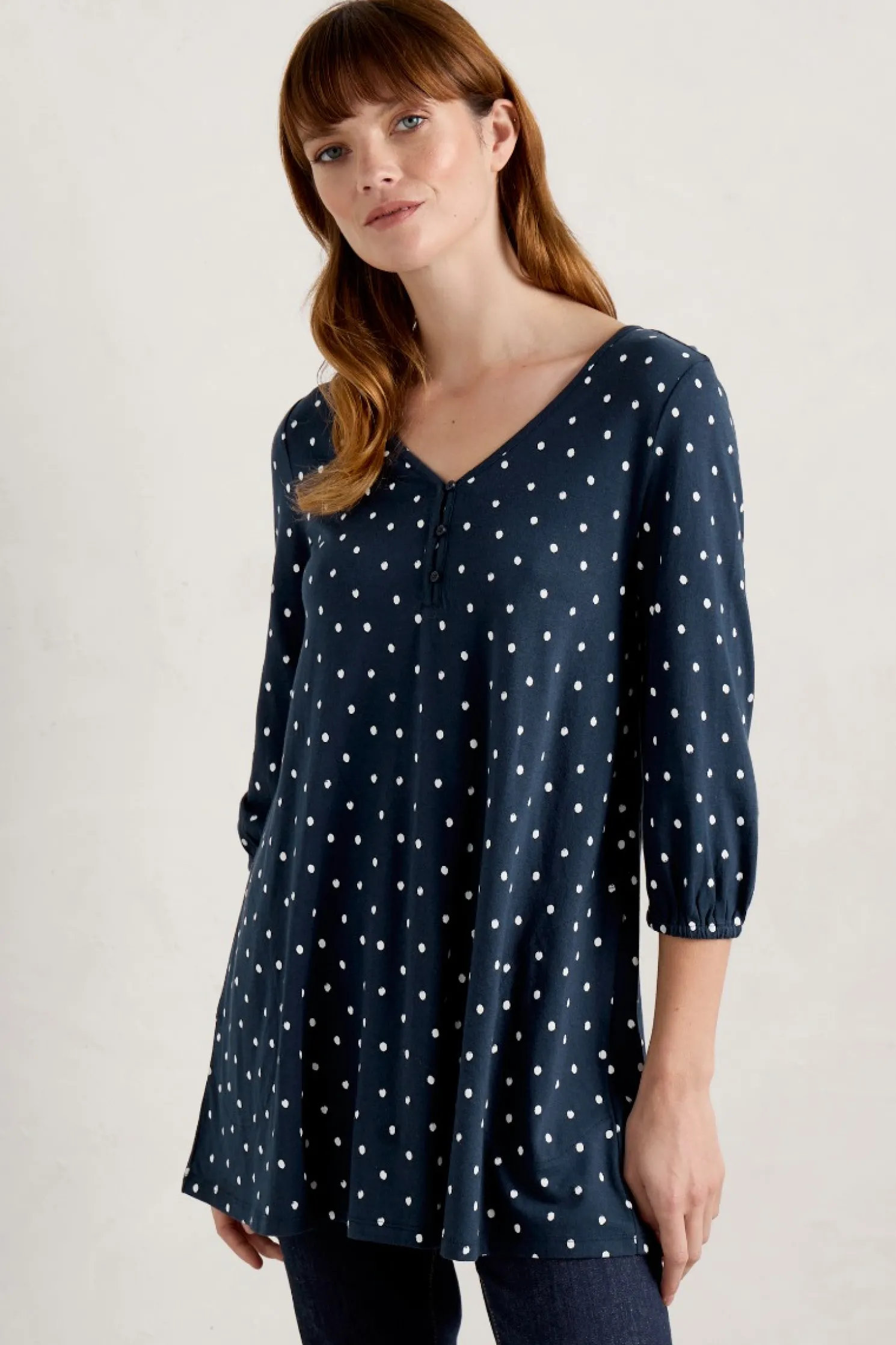 A Stylish V-Neck Tunic With Feminine 3/4 Blouson Sleeves. Crafted From Soft Jersey For A Beautiful Weight And Drape That Lends A Soft Swing To The Body. The Perfect Piece For Days When Comfort And Style Are Key.